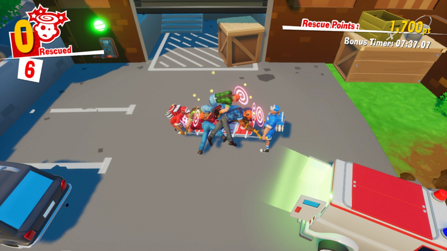 Das gefällt dem bösen Supergenie Käpt’n Superhirn natürlich ganz und gar nicht und er droht der Ärzteschaft sowie uns Helferlein furchtbare Rache an. Schließlich hat er sich die Mühe gemacht, seine Mitbürger zu verduseln und eine Heilung kommt gar nicht in Frage! Und so verschwindet der Erzfeind und wenig später landen auch schon zwei weitere Notfälle in der Notrufzentrale. Auf der Karte kann ich mich nun für eine Mission entscheiden, anschließend geht es ohne Rücksicht auf Verluste zum Zielort und dort angekommen startet ein Timer. Innerhalb dieser Zeit gilt es nun die Dusler in den Krankenwagen zu schaffen und am Krankenhaus abzuladen. Der Weg zu den Hilfebedürftigen ist natürlich immer wieder durch diverse Hindernisse blockiert und weitere Mechaniken wie ein lenkbarer Wasserstrahl oder eine verschiebbare Kiste helfen beim Lösen der Rätsel. Später kommen neben den Storymissionen auch Nebenaufgaben hinzu, die sich rund um neue Mechaniken wie eine Zeitbombe, die beim Aufheben anfängt zu ticken, oder eine Zweimannsäge, die rhythmisch von zwei Personen bedient werden muss, drehen. Diese finden im Laufe des Spiels immer wieder an Anwendung finden und enthüllen im Idealfall sogar versteckte Sammelobjekte.