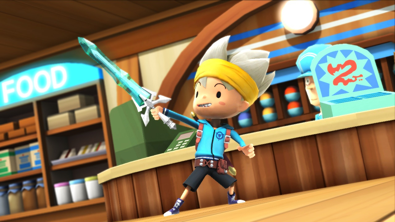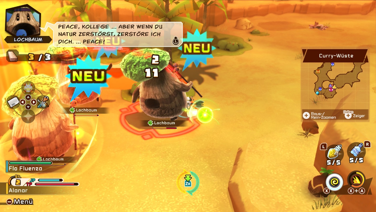 Immerhin ist das Kampfgeschehen schnell erlernt und beherrscht: Bis zu sechs Waffenhand-Objekte – Schwerter, Schilde, Speere und so weiter – könnt ihr gleichzeitig auf eine Mission mitnehmen, dazu noch je ein Heiltrank und ein Unterstützungs-Spray. Eure Bewaffnung könnt ihr dann entweder umständlich manuell mit einem Druck auf die rechte Steuerkreuztaste und Herumsuchen im Auswahlmenü herauspicken oder simpel und einfach mit der ZR-Taste durchschalten. Bei letzterer Methode praktisch: Solltet ihr ein Werkzeug haben, das gegen den aktiv in die Mangel genommenen Gegner sehr effektiv ist, schaltet die Schultertaste automatisch zur entsprechenden Waffe. Aber auch allgemein ist ein häufiger fliegender Wechsel der Ausrüstung ratsam. Jede Waffe verfügt nämlich nur über eine begrenzte Haltbarkeit, die sich relativ langsam wieder auflädt. Im „zerbrochenen“ Zustand lassen sich die sogenannten Jaras nur noch behäbig schwingen und verwehren euch zudem die Nutzung der zwei Spezialmanöver pro Item. Durch die ständige Waffenjongliererei werden die Kämpfe zumindest selten absolut einschläfernd, dennoch fehlt es den insgesamt eher simplen Intermezzos über weite Strecken des Spiels an Tiefgang.