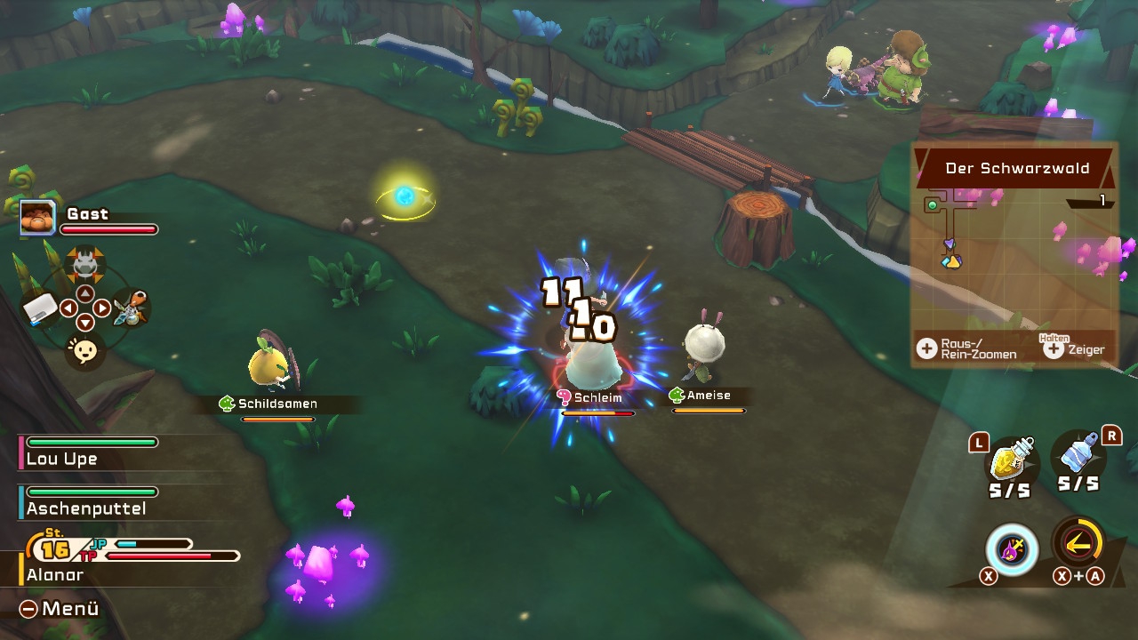 Dass Snack World: Die Schatzjagd ursprünglich auf dem 3DS daheim war, merkt man dem Titel in einigen Bereichen gar nicht an. So fallen die Charaktere äußerst detailliert aus und erinnern zum Teil beinahe an Knetmodelle, während beispielsweise das Königreich Croquette nicht mit vielerlei Dekoration geizt – wenn auch im von mir ausschließlich gespielten Handheld-Modus leider zu Lasten der Framerate. Wenn es jedoch um die kompakten Questareale oder zum Teil ziemlich kantigen Objekte geht, wird doch deutlich, dass dieses Rollenspiel von einem bedeutend schwächeren System stammt. Immerhin glänzt der Soundtrack dafür mit peppigen Melodien, die euch den Abenteurer-Alltag versüßen. Vorausgesetzt natürlich, ihr bekommt ihn auch zu hören, denn gerade in den Kämpfen sorgen die sich stetig wiederholenden Phrasen von Freund und ganz besonders Feind dafür, dass alle anderen Töne sang- und klanglos untergehen. Die Sprüche der Marke „Bissss dann, ihr Ssssäcke!“ von einer Giftschlange oder „Hände weg von meinem Schinken!“ vom Ritter-Schwein mögen zudem im Einzelfall noch ganz witzig sein, wenn ihr jedoch eine ganze Horde besagter Monster in schneller Abfolge erlegt, werden sie schlichtweg nervtötend. Vollständige deutsche Sprachausgabe für die Story-Dialoge oder gar das Anweisungs-Geschnatter im linken oberen Bildrand gibt es übrigens keine, stattdessen bekommt ihr auch hier nur kurze – und teilweise leider auch nicht ganz so kurze – Phrasen immer wieder aufs Neue serviert.