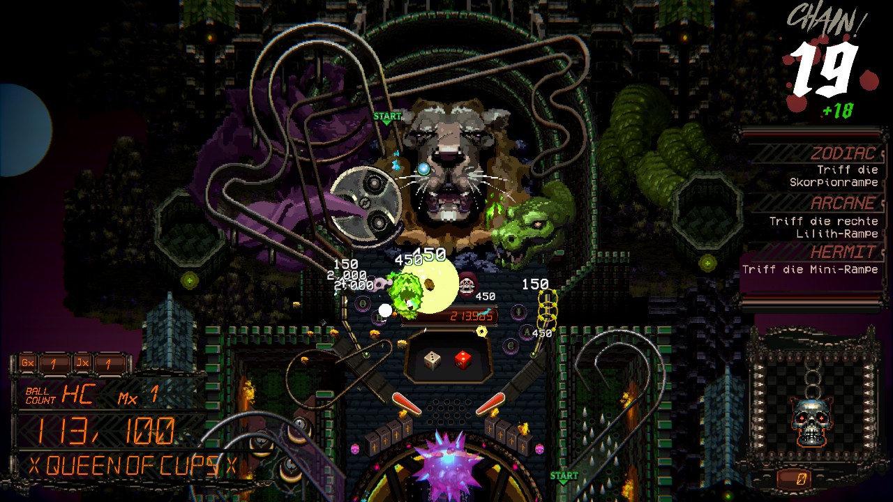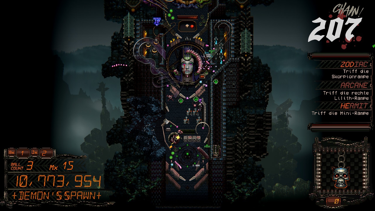Dabei bietet Demon's Tilt auf dem Papier eigentlich recht wenig: Genau einen Tisch gibt es, auf dem ihr euer Flipper-Geschick unter Beweis stellen dürft. Drei Schwierigkeitsstufen, von denen sich die einfachste im Layout dezent unterscheidet und die höchste euch auf lediglich eine Kugel anstatt der üblichen drei beschränkt, sorgen zumindest für ein wenig Variantenreichtum – für jeden Modus gibt es zudem eine eigene lokale und Online-Rangliste. Tatsächlich stellt man jedoch schnell fest, dass die Struktur des Tisches die Anzahl wieder ausgleicht. Die längliche Spielfläche ist nämlich in drei Sektionen unterteilt, die allesamt mit markant unterschiedlichen Herausforderungen und Zielen aufwarten. So gibt es im mittelgroßen unteren Drittel diverse kleinere Kreaturen zum Abschießen, während der kompakte oberste Abschnitt mit einer imposanten Chimäre aufwartet. Allein dies verschafft jedem Teilstück einen bedeutend anderen Charakter, ohne dass sie wirklich deplatziert wirken.