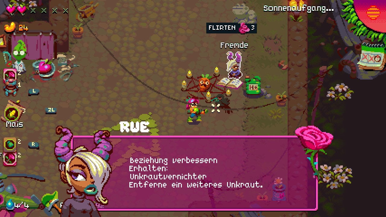 Leider geht einem nach einer Hand voll Startpäckchen in der Regel das Saatgut aus, in das nahegelegene Dorf geht es erst nach Abschluss des Tages und selbst dort sind die Nutzpflanzen recht teuer. Wie kommt man also an weiteres Gewächs ran? Klarer Fall: Ab in die Wildnis! In den vier Himmelsrichtungen um euren Hof herum befinden sich nämlich vier Biome mit unterschiedlichen erbeutbaren Samen – und diversen Monstern, die alle Eindringlinge liebend gerne unter die Erde bringen. Die kleinen von Kreaturen bevölkerten Lager beherbergen allerdings nicht nur das künftige Erntegut: Auch diverse, bei jedem Neuanfang zufällig verteilte Upgrades und Werkzeuge lassen sich hier einsacken. Von Nutztieren, die euch bei euer Landarbeit unterstützen, über Tauben mit Einweg-Phänomenen wie Regenwolken bis hin zu nach einer gewissen Aufladezeit wiederverwendbaren Traktoren ist alles dabei, was sich der postapokalyptische Bauer wünschen könnte. Einige Dinge lassen sich übrigens auch im Dorf erwerben, kosten dabei aber entweder eine gewaltige Schippe Geld oder die deutlich selteneren Rosen, die ihr erst mit gefundenem Saatgut selber anbauen müsst. Letztere werden übrigens auch in ein seichtes Beziehungssystem eingebaut: Jeden Abend erscheinen zwei zufällige Junggesellen im Dorf, die euch im Tausch gegen Rosen Upgrades anbieten. Habt ihr ausreichend mit ihnen geflirtet, dürft ihr sie sogar ehelichen, woraufhin sie euch permanent auf der Farm unterstützen. Wirklich tiefgründig mag die Romanze dabei nicht sein, aber hey, in schweren Zeiten ist jedes bisschen emotionale und praktikable Hilfe mehr als willkommen!