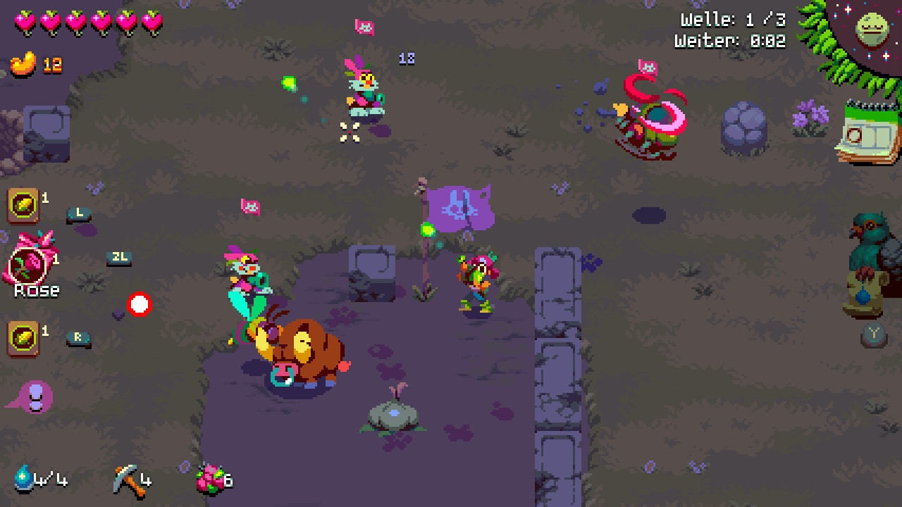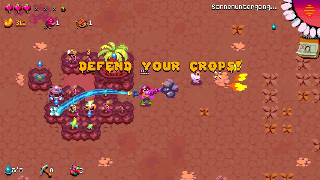 Präsentationstechnisch fällt Atomicrops maßgeblich mit seinem schrägen Cartoon-Stil auf, der auch durch den nicht minder merkwürdigen, aber auch erstklassig passenden Soundtrack gestützt wird. Die pixeligen Feldfrüchte springen munter grinsend in ihren Erdflecken herum, pinke Kaninchen mit diversen Bewaffnungen machen euch das Leben schwer und speziell die Jahreszeit-Endbosse sind wunderbar abgedreht gestaltet worden. Leider fällt inmitten dieser pixeligen Animationspracht häufiger auch mal auf, dass das Spiel zumindest im von mir hauptsächlich gespielten Handheld-Modus bei mächtig Trubel auf dem Schirm zu unschönen Rucklern neigt. Unschön, da man natürlich genau in solchen Situationen gerne mal in eine herumschwirrende Kugel rennt.