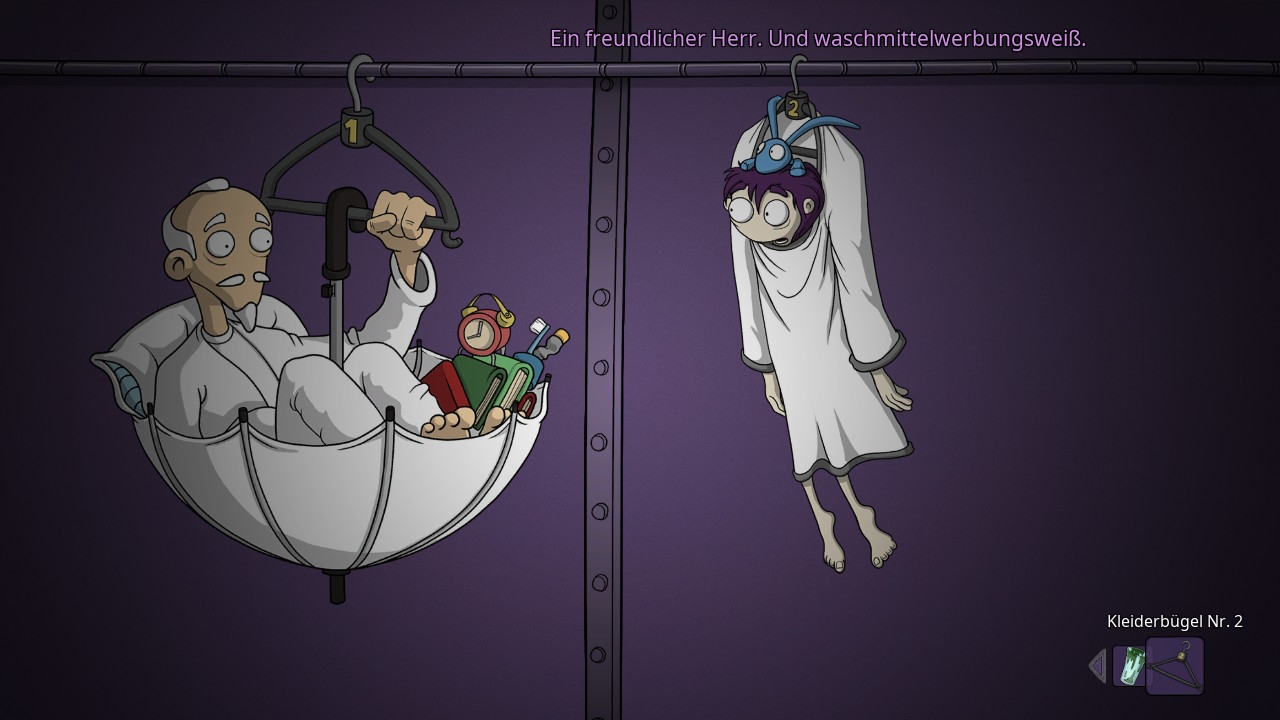 Doch zurück zum Abenteuer, denn allein die Gummizelle, in der man beginnt, schlägt bereits gut den Ton an. Weil Ednas Denkweise alles andere als bodenständig ist, kann sie beispielsweise problemlos mit so ziemlich jedem Objekt reden – und auch Antworten erhalten. Wirklich bedeutend für den Spielfortschritt ist diese Fähigkeit nie, doch die Massen an Kalauern und lockeren Unterhaltungen fallen umso häufiger urkomisch aus. So tauft sie ihr frisch eingesacktes Stuhlbein Stuhlfried, nur um kurz darauf nach einer gewissen anderen Aktion dessen „Tod“ zu bedauern. Selbst bestimmte Objekt-Kombinationen müssen nicht immer mit der Standard-Phrase „Das klappt so nicht“ abserviert werden. Edna kann beispielsweise sehr wohl auf so ziemlich allem mit dem Kugelschreiber herumkritzeln oder die Situation mit einem aufgelesenen Comic-Heft abgleichen. Der halbe Spaß von Edna bricht aus ist zweifelsfrei das ausgiebige Erkunden der im Prinzip recht überschaubaren Umgebungen und Auffinden der zahlreichen versteckten Witze – auch wenn die Protagonistin selbst sich nichts sehnlicher von einem Flaschengeist wünschen würde, als dass der Spieler genau dies unterlässt.
