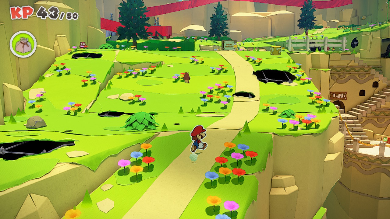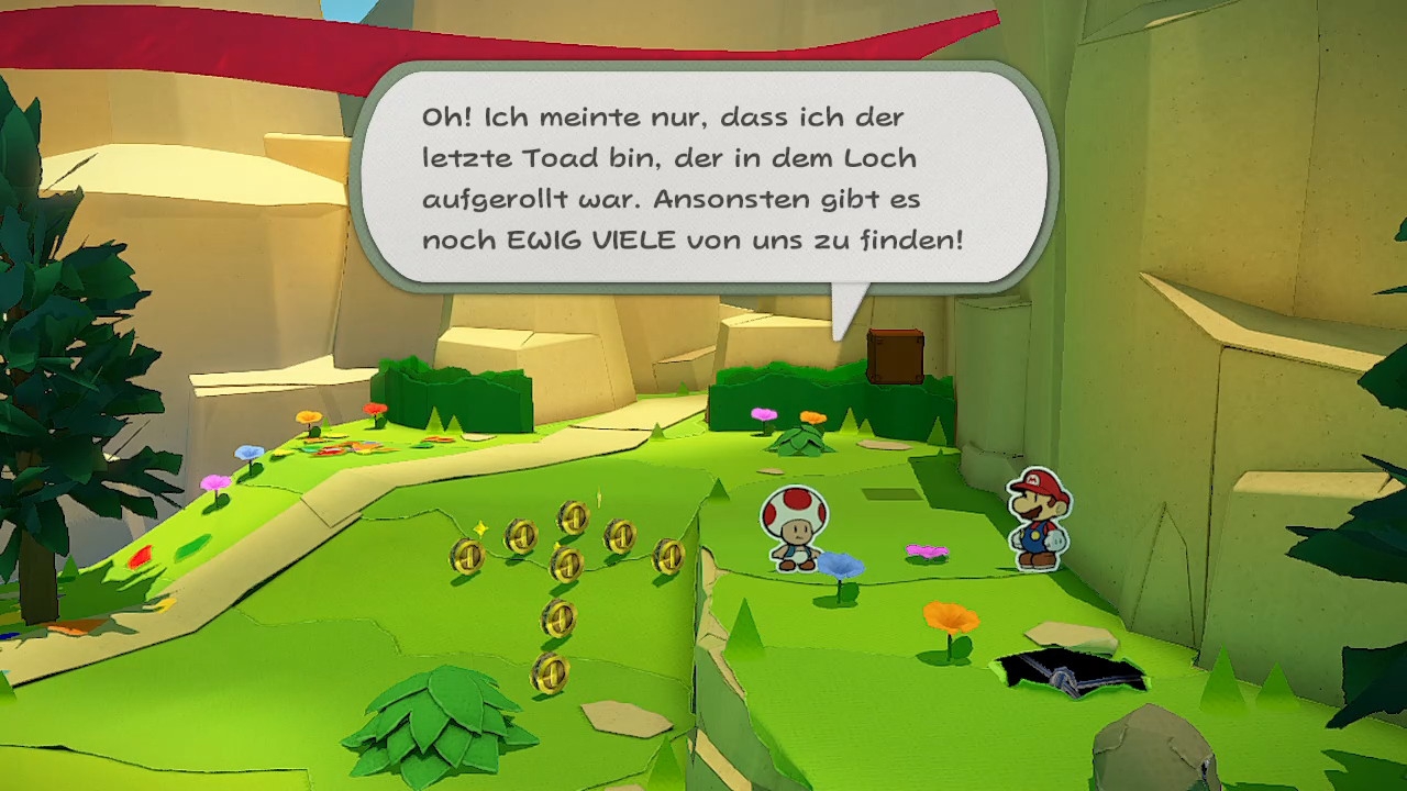 Der Handlungsrahmen ist Super Mario-typisch schnell erklärt: Origami-Figur und König Olly faltet die Toads des Pilzkönigreichs sowie die Schergen von Bowser zusammen und erobert im Handumdrehen das Schloss von Prinzessin Peach. Nun in komische Luftschlangen gewickelt, muss Mario gemeinsam mit seiner neuen Begleiterin – einer freundlich gesinnten Origami-Dame namens Olivia – losziehen, um die farbenfrohen Bänder aufzulösen und sich so Zutritt zum Schloss zu verschaffen. Das ist natürlich einfacher gesagt als getan, sind doch die jeweils anderen Enden der Luftschlangen an entlegenen Winkeln des Königreichs versteckt und selbstverständlich von Schurken bewacht. Aber Mario hat auch schon so einige Abenteuer hinter sich, von daher nimmt er diese um die 30 Stunden umfassende Reise liebend gern auf sich. Trotz der eher simplen Prämisse verfügt die Handlung durchaus über interessante Wendungen und erzählerische Highlights, die mich während meiner Spielzeit gut bei Laune hielten. Dazu tragen auch die Charaktere bei, auch wenn Olivia – Marios einzige konstante Begleitung und dementsprechend die präsenteste Figur mit Sprechrolle – mir mit ihrer kindlichen Freude über den Abenteuerausflug erst ans Herz zu wachsen begann, nachdem sie nicht alle Nase lang den Spielfluss mit irgendwelchen Tutorials unterbrach. Entsprechend zäh spielen sich dann auch übrigens die ersten paar Stunden.