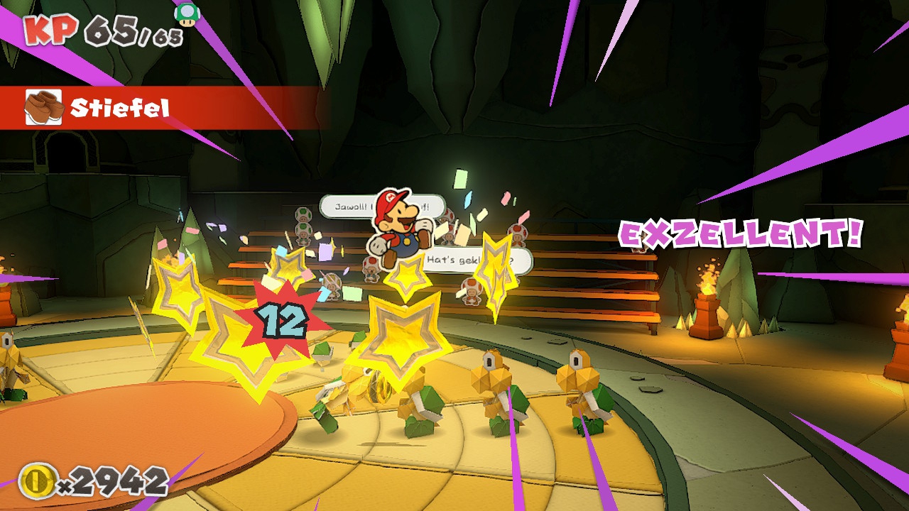 Alles andere als witz- und sinnlos sind wiederum die Bosse, von denen The Origami King mehr als reichlich bietet. Hier wird die gesamte Kampfmechanik praktisch auf den Kopf gestellt: Der Obermotz steht in der Spielfeldmitte und Mario muss ihn irgendwie erreichen. Zu diesem Zweck läuft er automatisch über die Ringfelder wie auf einem Spielbrett, wobei Pfeile die Marschrichtung angeben. Dabei kann er Stärke-Booster, Tipps oder Schatzkisten auflesen, die Reise endet jedoch sobald Mario auf einem Aktionsfeld landet – sei es eines für normale Attacken oder eines, das mächtigere Spezialmanöver erlaubt. Entsprechend gilt es, am Anfang einer jeden Runde die Ringe so auszurichten, dass man direkt auf die jeweiligen Schwachpunkte der Bosse einwirken kann. Das ist natürlich im Angesicht des Zeitlimits für die Ringbewegung einfacher gesagt als getan, machte mir jedoch enorm Laune. Trotz Marios eingeschränkten Aktionsspielraums, da er immer noch nur springen, hämmern und auf Spezialfeldern Origami-Moves nutzen kann, kommen hier dank der trickreichen Bossmanöver interessante Knobeleien zustande, die gekonnt die Spannung aufrecht erhalten.