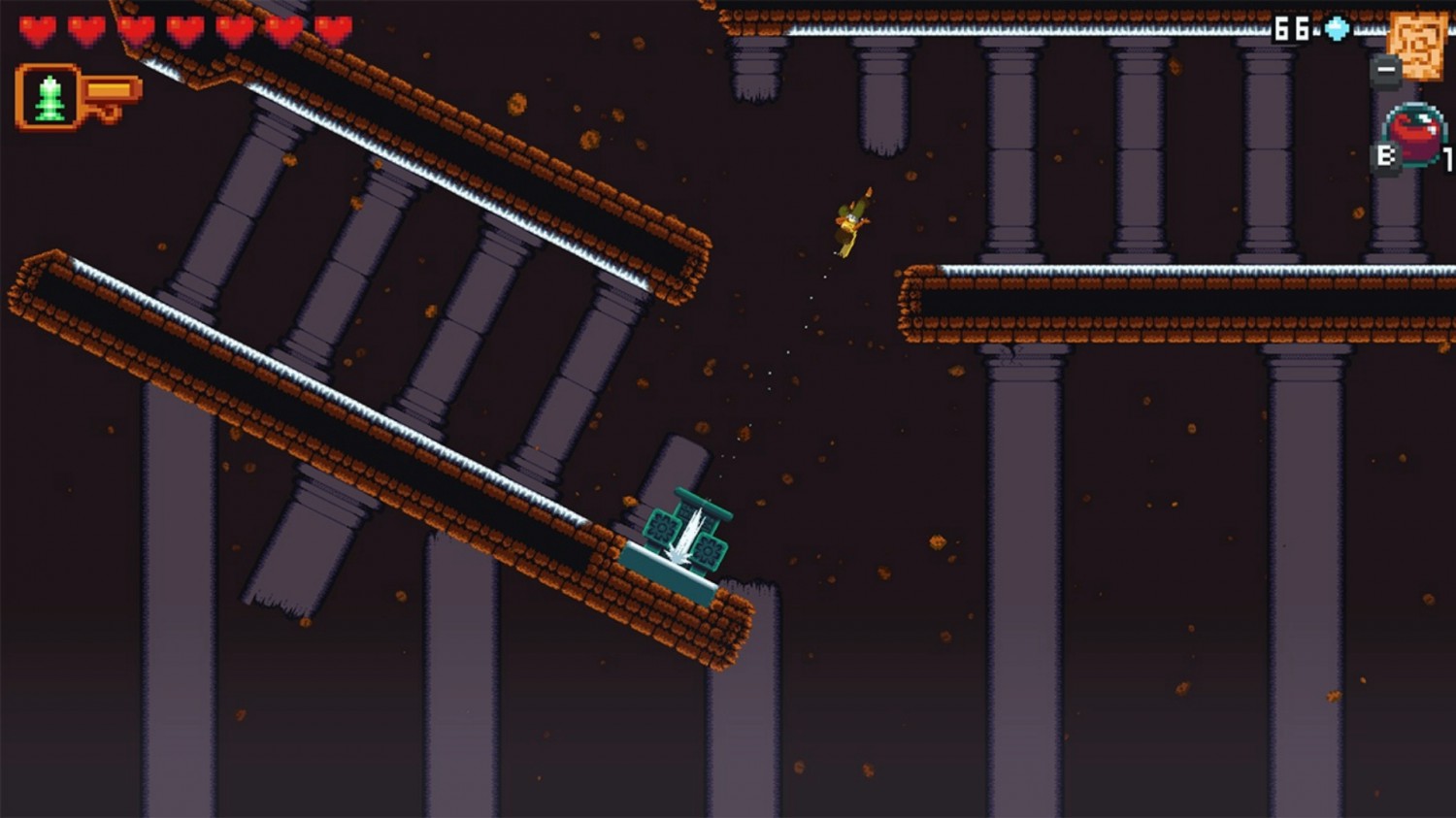 Auch die Natur der Spielwelt trägt ihr Übriges zur Verwirrung bei. Da die Salzwelt nun mal so ist wie sie ist, steht nicht nur Dandara öfter mal auf dem Kopf, sondern dreht das Spiel selbst auch hier und da die Ansicht des Ganzen. Warum erschließt sich nur bedingt, denn man es hat es ohnehin schon schwer genug sich zu orientieren. Dreht sich der aktuelle Raum dann noch um 90 Grad, hilft letztlich nur noch eine Neuorientierung via Minimap. Diese ist immerhin aber sehr detailliert, intuitiv bedienbar und allgemein die einzige Möglichkeit, sich zurechtzufinden.
