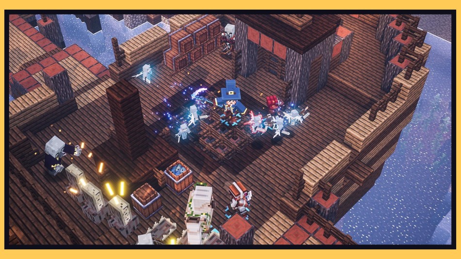 Auch auf den Fernkampf kann man zurückgreifen, wobei man wiederum die Wahl zwischen herkömmlichen Bögen, Armbrüsten oder anderen bolzenschießenden Apparaten hat. Gerade der Fernkämpf hätte noch ein wenig Feinschliff vertragen können, doch schon nach kurzer Eingewöhnungszeit kann man hier mächtig Spaß haben. Aufgepeppt wird das Ganze dann noch durch das komfortable Verzauberungssystem. Je erreichtem Charakterlevel steht dem Spieler ein Zauberpunkt zu. Diese können dann auf die Ausrüstungsgegenstände angewendet werden, wobei diese allerdings stets mit einer zufälligen Auswahl an Verzauberungen daherkommen. Zwar ist man hier immer an das Glück gebunden, doch animiert das simple System auch ziemlich zum Ausprobieren bestimmter Fähigkeiten. Bezogen auf die Komplexität des Spiels war es aus meiner Sicht eine gute Entscheidung von Mojang, das Verzaubern exakt so umzusetzen. Wer seine aufgemotzte Ausrüstung später zerlegt, bekommt die entsprechenden Punkte wieder gutgeschrieben und das Experimentieren geht von vorne los. Zusätzlich dazu kann jeder Spieler noch bis zu drei sogenannte Artefakte ausrüsten, welche die spielerische Abwechslung nochmals dank etlicher Ausrührungen auf die Spitze treiben. Hier kann man etwa seine Pfeile dank Feuerköcher in starke Feuerpfeile verwandeln, oder aber mit den Seelen besiegter Gegner eine Art Kamehameha entfesseln, während das eigene Lama zur Verteidigung um sich spuckt – sehr gut gelungen!