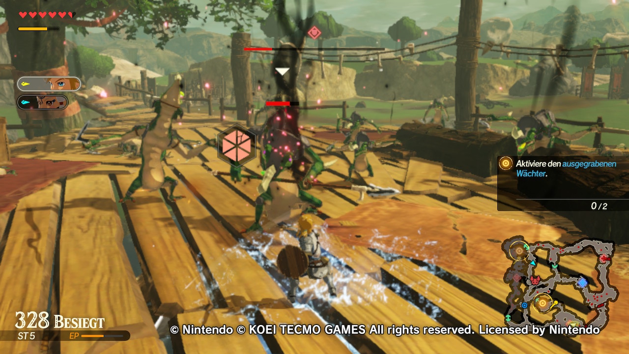 Um auf dem Schlachtfeld jederzeit die volle Kontrolle zu behalten, dürft ihr natürlich wieder einmal bis zu vier Charaktere über das Feld scheuchen – jeweils einen aktiven Kämpfer sowie ein bis drei Begleiter. Leider stellen sich eure Kameraden gefühlt noch schrecklicher an, als sie es bereits im ersten Hyrule Warriors taten. Nicht selten sind mir Situationen untergekommen, in denen ich meine Mitstreiter an einen bestimmten Punkt beorderte, sie sich aber nur im Schneckentempo rüberbewegten und schlussendlich nicht zum rechten Zeitpunkt dort auftauchten, wo ich sie benötigte. Anders als bei Fire Emblem Warriors zuvor greifen sie auch abermals nicht aktiv ins Gefecht ein, können umgekehrt aber auch nicht das Zeitliche segnen, wenn sie nicht eurer direkten Kontrolle unterstehen. Selbst wenn ihre Energieleiste auf das letzte Viertelherz geleert ist, geben sich nicht klein bei. Dadurch verliert man zumindest kein Gefecht aufgrund von unglücklichen Positionierungen und kann seine Gefährten notfalls auch als Quasi-Extraleben zweckentfremden.