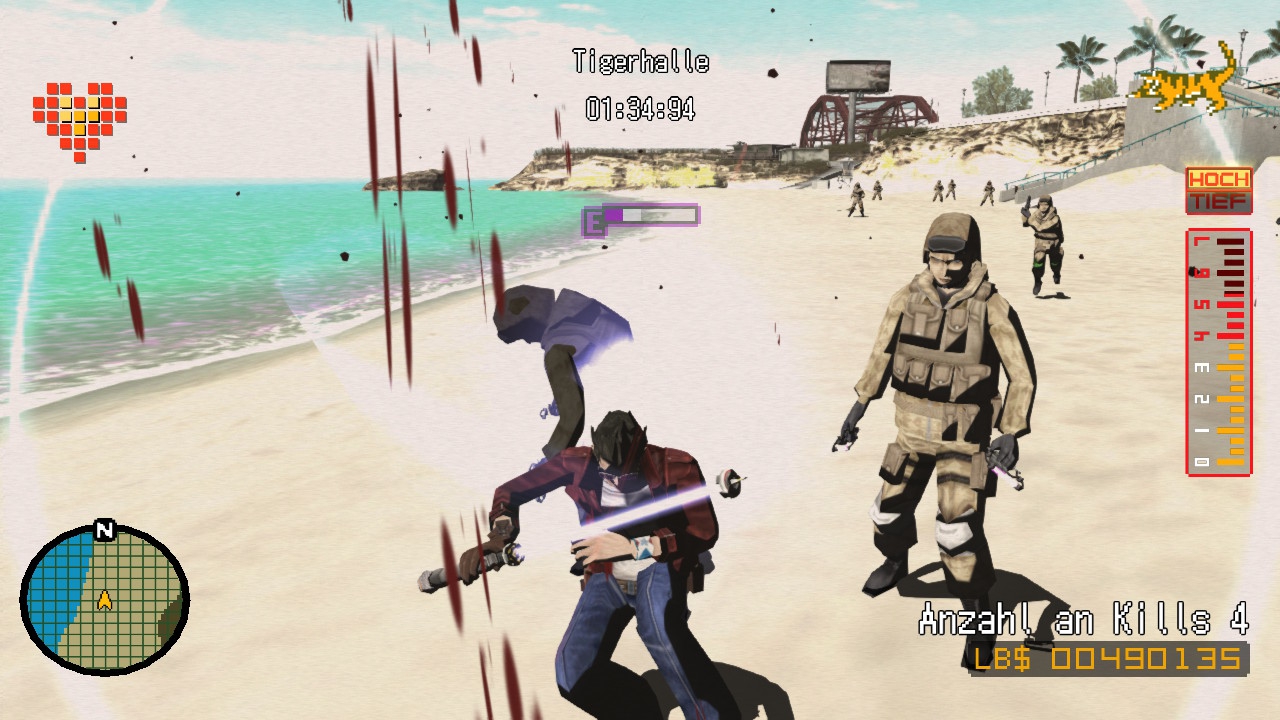 Was hingegen leider nach wie vor nicht wirklich toll ist: Die offene Spielwelt, die ihr zwischen den Rangkämpfen erkundet. Travis' Heimatort Santa Destroy ist nämlich technisch gesehen frei begehbar, bietet allerdings recht wenig von Interesse. Es gibt massig Mülleimer nach Shirts und Geld zu durchwühlen, Upgrade-Kugeln einzusammeln und knifflige Freikampfmissionen zu erledigen, wirklich unterhaltsam ist dies jedoch nicht. Ähnliches gilt für die Minijobs und Killer-Quests, die bei entsprechenden Auftraggebern abgeholt werden. In beiden Fällen müsst ihr für jede Aufgabe erst von einer zentralen Annahmestelle zum Missionsort fahren, um dort dann entweder ein ödes Minigame der Marke Rasenmähen oder Graffitireinigung zu erledigen oder eine Hand voll Handlanger auf Eis zu legen. Blöd nur, dass ihr diese Jobs in der Regel mehrfach durchmachen müsst, um die Teilnahmegebühr für den nächsten Hauptkampf zu decken. Die Folge: Ewige Pendeleien zwischen zwei Punkten. Das ist vermutlich durchaus gewollt, denn der gewollt auf cool getrimmte Travis führt beileibe kein erstrebenswertes Leben, zumal keiner der Rangkämpfe mehr Geld ausschüttet, als er investiert. Der Gedanke der absichtlichen Spielzeitstreckung lässt sich jedoch nicht vollkommen abschütteln.