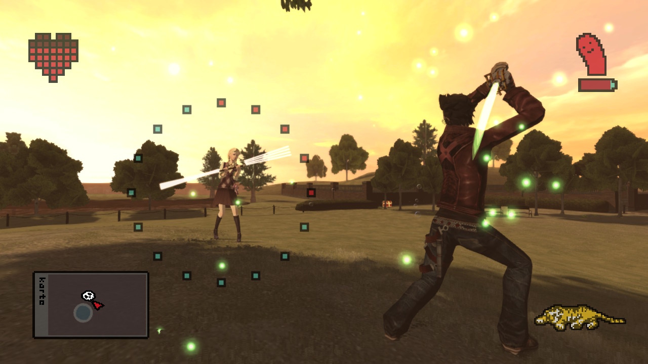 Das schlägt sich auch auf die Riege der Bosse nieder, selbst wenn – wie zuvor angedeutet – noch mehr als genug schräge Gestalten auf der Abschussliste stehen. Gleich zu Beginn eröffnet No More Heroes 2 beispielsweise mit einem Rapper mit Boombox-Kampfhandschuhen sowie einem Football-Starspieler samt Cheerleader-Truppe. Und wieder einmal reichen die kurzen Duell-Intros bestens aus, euch ein gutes Bild von den jeweiligen Killern zu machen. Die Fights selbst halten euch entsprechend gut auf Trab: Nur auf einfachster Schwierigkeitsstufe lassen sie sich durch weitestgehend blindes Tastengehämmere in die Knie zwingen. Auf mittlerem Level ist durchaus Taktik gefragt und ohne eine gesunde Portion Skill seht ihr auf der freischaltbaren höchsten Stufe selbst beim Tutorial-Boss alt aus. Das nach wie vor eingängige Kampfsystem – wieder einmal mit deutlich unterschiedlich spielenden Beam Katanas garniert – sorgt dafür, dass sich die Kämpfe nicht zuletzt aller Widrigkeiten zum Trotz fair anfühlen.