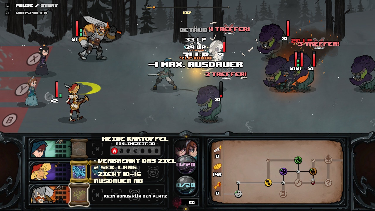 Sollte bei dem Versuch übrigens auch nur ein Held das Zeitliche segnen, gilt die Partie mitsamt aller gesammelten Upgrades und Zauber als verloren – ganz nach klassischer Roguelike-Manier eben. Der Tod ist allerdings noch lange nicht das Ende. Besiegte Gegner hinterlassen nämlich Seelen, die nach dem Ableben neue Objekte für kommende Runden freischalten. Das steigert die Überlebenschancen beim Reiseneuantritt, die tatsächliche Wirkung der Items muss allerdings experimentell herausgefunden werden – erst nach einmaligem Auflesen verrät euch das Spiel, was beispielsweise ein altes Gebiss oder eine Schriftrolle mit einer Fontänenzeichnung bewirken. Dementsprechend fühlt es sich des öfteren leider so an, als wäre das Vorankommen eher vom Zufall als vom Können des Spielers abhängig. Dass die zu durchquerenden Areale, die über eine simple Karte am Bildschirmrand angesteuert werden, ebenfalls zufällig generiert werden, stützt dieses Gefühl umso mehr. Tatsächlich habe ich jedoch bemerkt, wie ich mit dem Kernspielsystem vertrauter wurde und nach einigen Anläufen problemlos Bosse erlegen konnte, die mir zuvor wie unüberwindbare Hindernisse vorkamen. Trotzdem waren insgesamt 17 Anläufe nötig, bis mir überhaupt der erste Sieg gelang – nur um mir einen von vielen freischaltbaren Charakteren vorzulegen und in der nächsten Runde den Schwierigkeitsgrad dank neuer Skelett-Arten Gegner-Gattungen und einer zusätzlichen Stufe am Ende der Reise noch einmal hochzuschrauben. Aber wie sagt man so schön: Nur die Harten kommen in den Garten!