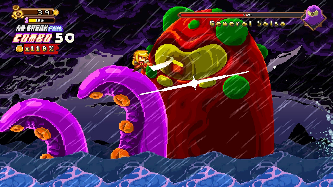 Langer Story kurzer Sinn: Eure vierköpfige Söldnertruppe soll eine Horde Fieslinge von einer Inselkette vertreiben und dabei jede Menge Gold einheimsen. Da das Team zudem erst beim letzten Urlaub sämtliche Ersparnisse verballert hat, kommt dieser Auftrag natürlich sehr gelegen. Die Handlung wird übrigens innerhalb des Spiels nicht großartig angeschnitten – stattdessen geht es direkt mit einer turbulenten Schiffsfahrt und einem Bosskampf als Tutorial-Abschnitt los, bei dem ich gleich mächtig einen auf den Deckel kriege. Die Steuerung ist zwar eingängig, verfügt aber dennoch über eine Hand voll beachtenswerter Eigenheiten. So lassen sich simple Angriffskombos entfesseln, durch die man sogar Kontaktschaden bei Feindberührung verhinden kann, dafür kommt man nur etwas behäbig wieder aus der Hiebkette heraus. Mit der A-Taste kann zum Sprint angesetzt werden, der sich auch zum Vorbeihuschen am Gegner mit folgendem Hinterrücksangriff nutzen lässt. Zu guter Letzt sind mit der X-Taste Sturmangriffe möglich, welche beispielsweise auch als Sprungverlängerer einsetzbar sind. Gegner herumschleudernde Aufladeattacken und einsetzbare Hilfsgegenstände runden die Move-Palette ab.