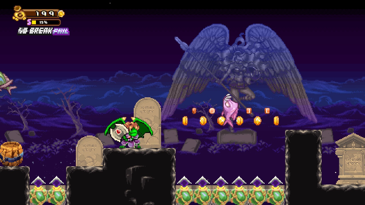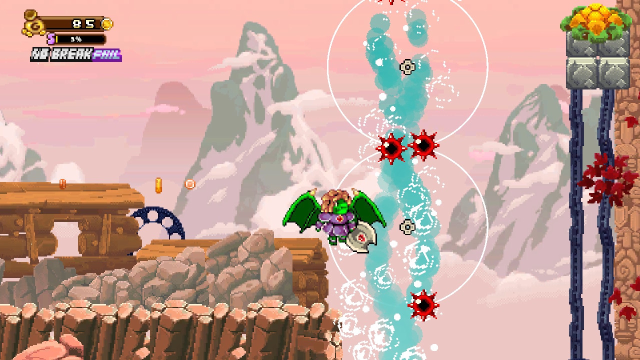 Mehr als dieses simple Manöverpaket braucht es nicht, um ein paar fordernde Stages zusammenzuzimmern. Sehr schnell erfordert Golden Force bereits den gezielten Einsatz des Sturmangriffs, um gerade so in Reichweite befindliche Plattformen zu erwischen oder den Fall auf schmerzhafte Stachelfallen zu verhindern. Besonders unfreundliche Gegnerformationen, die allem voran in den gelegentlichen bildschirmgroßen Kampfherausforderungen auftreten, erfordern ebenfalls einiges von euch ab, zumal das Spiel euch nur sehr sparsam mit Lebensenergie-Boostern versorgt. Das sorgte in meinem Fall an einigen Stellen zu ziemlich nervigen Frustmomenten, zumal Golden Force auch mit Checkpoints geizt – die teils gefühlt langen Level bieten in der Regel nämlich nur einen Rücksetzpunkt gen Stufenmitte, ganz wie es etwa bei Genre-Mitstreiter Mega Man der Fall ist. Trotzdem ist, und das möchte ich dem Titel durchaus hoch anrechnen, jede Herausforderung mit Geduld und Planung schaffbar und nur weniges dem Zufall überlassen. Maßgeblich Momente, in denen es nach unten geht, können aufgrund der ungünstigen Kamera-Ausrichtung schon mal zum Glücksspiel ausarten. Wenn dann aber mal ein Run richtig locker-flockig abläuft, fühlt sich dies im Angesicht der effektvoll zerberstenden Gegner und Massen an Klimpergold entsprechend gut an.