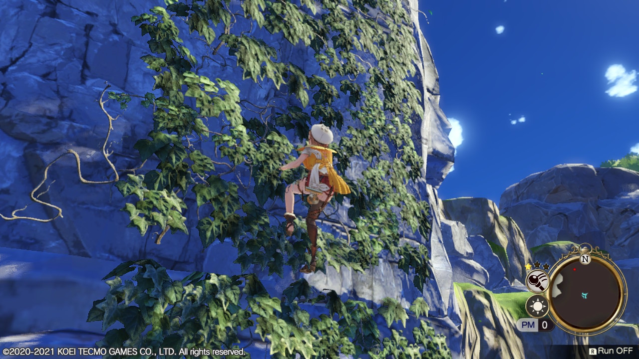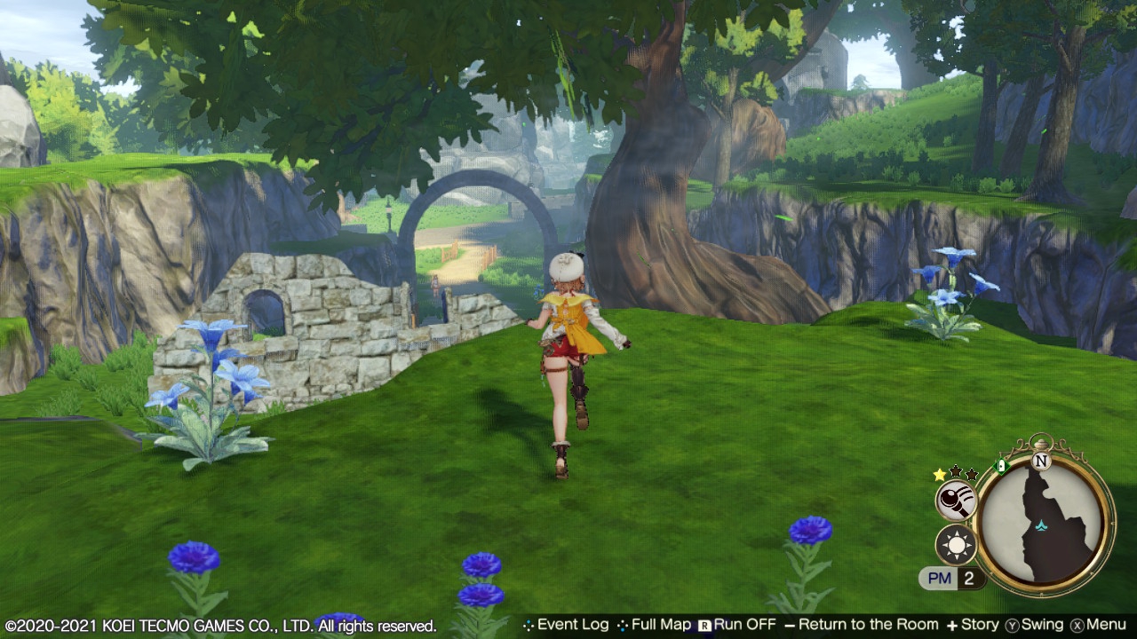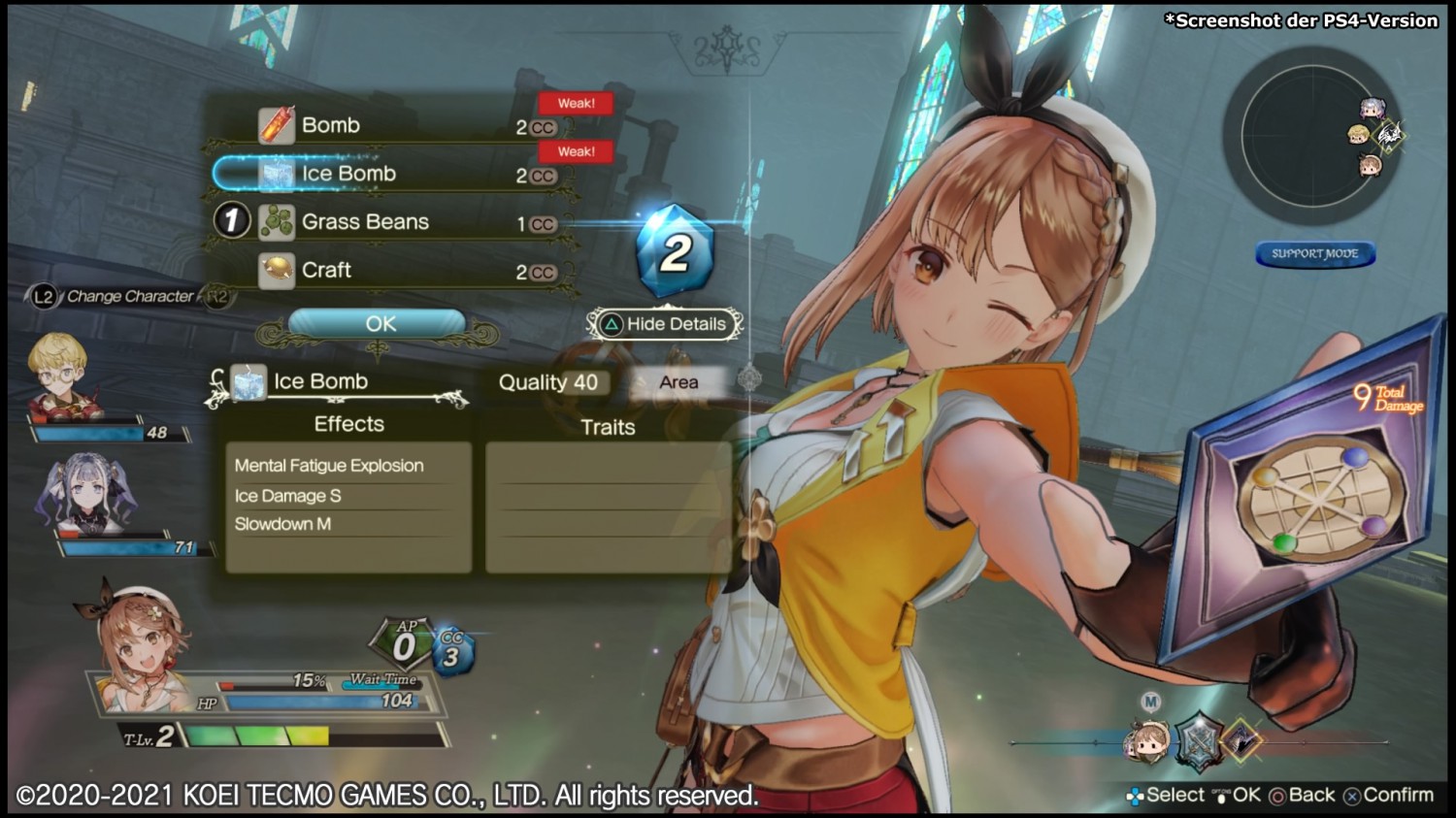 Ist die Truppe angemessen vorbereitet, geht es hinaus in die Wildnis, wo Materialien und Monster auf euch warten. Bis zu fünf über ein Schnellwahlsystem zugängliche Hilfsobjekte kann Ryza dabei schwingen, um mit ihrem Sprengstab etwa Steine zu zerschmettern, Holz mit Axthieben zu sammeln oder seltene Blumen sorgsam mit einer Handsichel zu schneiden. Ärgerlich ist hierbei höchstens, dass Ryzas Sammelkorb über ein nicht expandierbares Limit verfügt und fleißige Sammler gerade im späteren Spielverlauf bereits nach Erkundung eines halben Gebietes schon die Taschen voll haben können. Dass man sich zum Abladen jederzeit auf Knopfdruck ins heimische Atelier zurückteleportieren und anschließend dank Schnellreisefunktion zurück zum letzten Areal springen kann, lindert den Schmerz nur bedingt – angenehmer wäre es, wenn der Sammelkram direkt im Container der Basis landen würde.