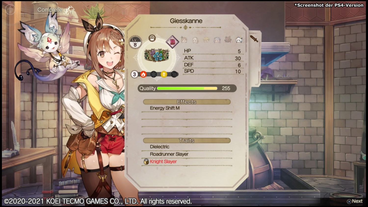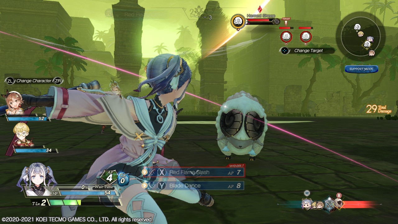 Etwas seltsam ist übrigens die Item-Nutzung geregelt, wenn auch anders als beim ersten Atelier Ryza. So sind zwar nochmals sogenannte Kernladungen notwendig, um die prinzipiell unendlich oft nutzbaren Sprengkörper, Plasmakugeln und Tinkturen zu nutzen, die werden jedoch vollständig während des laufenden Kampfes verdient – schlicht durch Einsatz eurer Spezialattacken. Zu Beginn macht dies die Items vergleichsweise nutzlos, gehen die meisten Feinde doch vorher durch die stetig hereinprasselnden Manöver in die Knie. Mit den richtigen Upgrades kann sich jede Figur aber auch einen gewissen Ladungswert zum Kampfstart verdienen und direkt die mittelschweren Geschütze auspacken. Das war dann auch der Punkt, an dem sich bei mir ein angenehmer Gefechtsrhythmus einstellte. Ich ertappte mich dabei, wie ich praktisch von einer Konfrontation in die nächste rannte, weil ich schlichtweg meine helle Freude am Mix aus effektvollen Angriffsketten und abrundender Item-Bombardierung hatte. Und als ich zur Auffrischung meiner Erinnerungen Teil 1 noch einmal in meine Switch einlegte, bekam ich sichtlich Probleme damit, mich in das vergleichsweise langsamere und unkomfortablere alte Kampfsystem hineinzufinden.