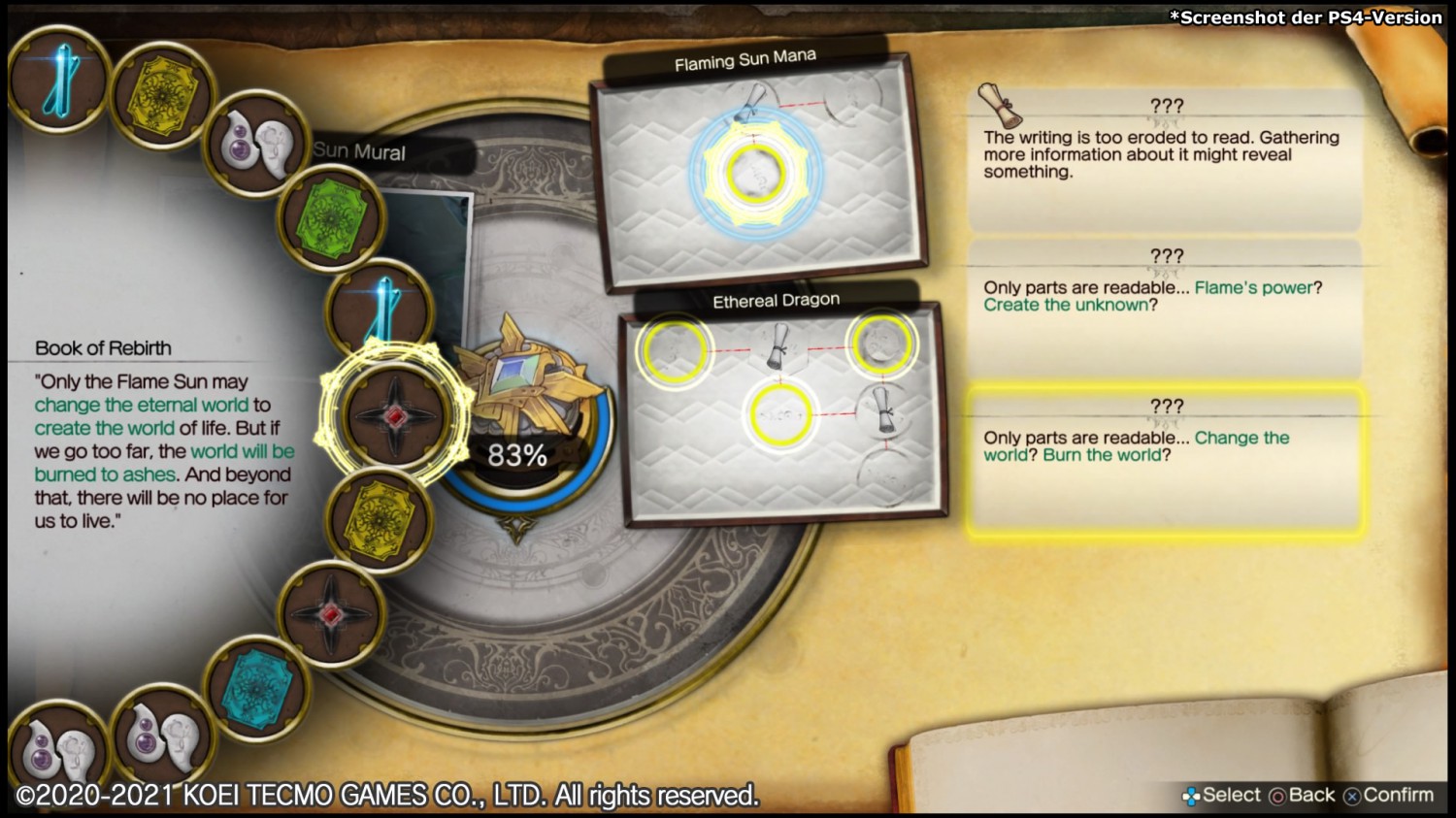 Je nach Spielweise kann dieses Abenteuer schon mal gut und gern zwischen 30 und 45 Stunden einnehmen. Tatsächlich fasst sich die Haupthandlung von Atelier Ryza 2 jedoch vergleichsweise kurz. Klar werden wichtige Ereignisse und Entwicklungen stets in Zwischensequenzen vorangetragen, ein Großteil der Erzählungen findet aber entweder in der Gestaltung der Umgebungen oder in aufgestöberten und zusammengefügten Erinnerungen statt. Jede Ruine wird nämlich mehr oder minder in zwei Phasen erkundet: Zunächst verschafft ihr euch einen groben Überblick, bergt Schätze und entledigt euch bestimmter Kreaturen. Danach macht ihr mit Hilfe eines aufgestöberten Relikts Erinnerungsfragmente ausfindig, die es anhand mal mehr, mal weniger eindeutiger Hinweise zusammenzusetzen gilt. Auf diese Weise erfahrt ihr Schritt für Schritt, was die alte Zivilisation, die in den Ruinen daheim war, überhaupt erst in den Untergang getrieben hat. Doch so interessant diese Erzählungen teilweise auch sein mögen, werden sie leider als vergleichsweise schmucklose Texte präsentiert. Diese sind übrigens, ganz wie der Rest des Spiels, lediglich in englischer Sprache enthalten. Eine deutsche Lokalisierung gibt es auch bei Atelier Ryza 2 nicht.