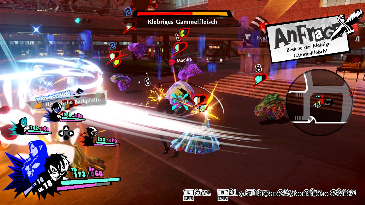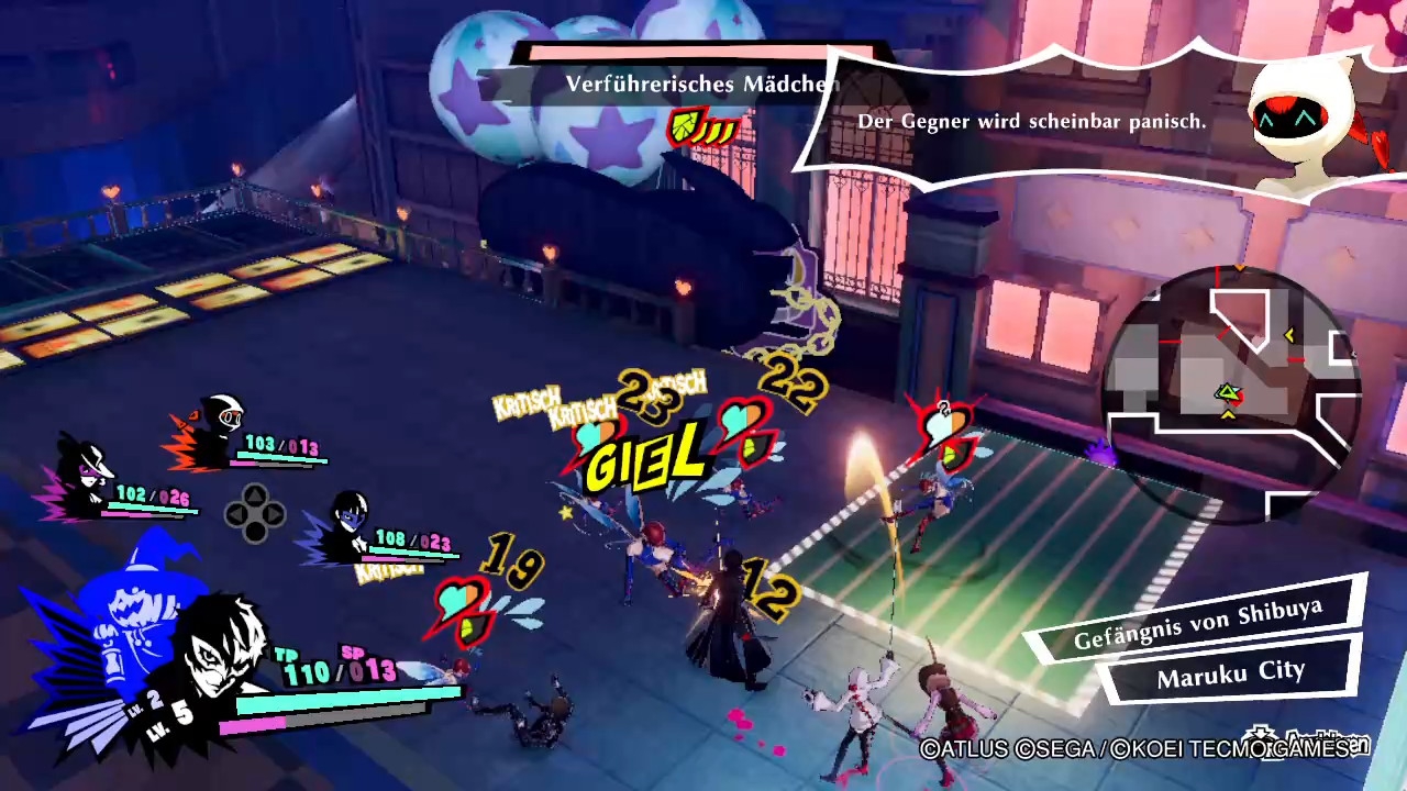 Wäre es nicht für einige fehlende Details bei den Charaktermodellen, könnte man an vielerlei Punkten glauben, man hätte es mit dem klassischen Persona 5 zu tun – dermaßen gut fing Omega-Force den Look des Vorgängers ein. Selbst die Menüs präsentieren sich allesamt stilsicher und verspielt! Auch wissen die vielfältigen Kreaturen in den Gefängnissen durch ihr ausgefallenes Design und die simplen, jedoch effektiven Animationsphasen zu überzeugen. Ob Freund oder Feind: Jeder Angriff weist eine effektreiche Wucht auf, die für ein wohliges Kampfgefühl (und dezente Übersichtsprobleme) sorgt. Die Performance der Switch-Version speziell fällt aber leider eher gemischt aus. Während das Action-RPG im TV-Betrieb in meinen gelegentlichen Testphasen weitestgehend rund lief, sieht das Bild im von mir hauptsächlich gespielten Handheld-Modus teils ganz anders aus. Bei größerem Effektaufkommen sind Ruckler keine Seltenheit und manche Gefechte – darunter auch einige Bossfights – verkommen zu regelrechten Ruckelpartien. Schön ist das jedenfalls nicht! Da ist es beinahe vernachlässigbar, dass die Charakterporträts in den Dialogsequenzen leider nur die Posen der Originalausgabe von Persona 5 aufweisen und nicht die zahlreichen neuen Variationen der Royal-Version. Wo sich Strikers hingegen zu Punkten weiß, ist die musikalische Ebene. Eingängige neue Musikstücke sowie Warriors-typische Rock-Remixes bekannter Tracks sorgen in jeder Situation für die richtige Begleitung und nahmen mir persönlich auch zumindest leicht den Schmerz an den langwierigen Bosskämpfen. Gleichermaßen weiß die englische Tonspur zu überzeugen, auch wenn es hier und da dezente Abmischungsfehler gibt, wegen derer beispielsweise eine Figur stellenweise etwas zu leise klingt. Und ja, die japanische Sprachausgabe ist für alle Liebhaber der Originaltonspur natürlich ebenfalls mit dabei.