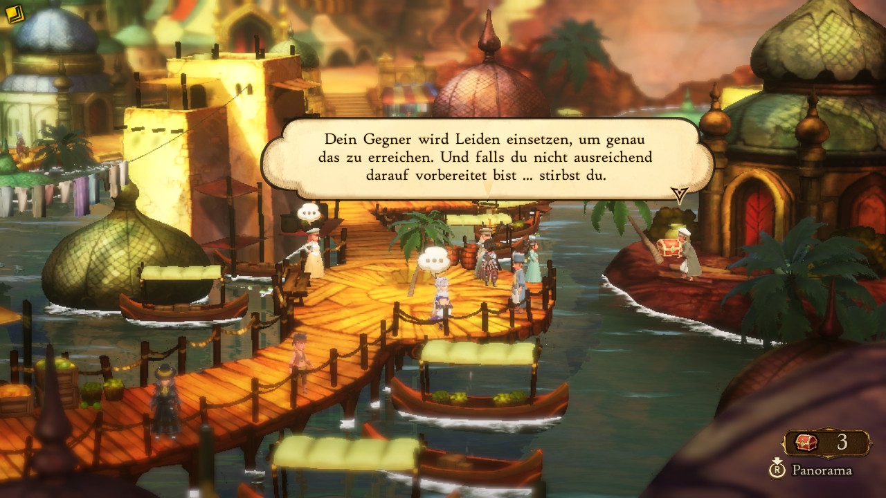 Während der generelle Story-Fortschritt also pausiert, kümmert ihr euch zumindest um diverse lokale Probleme. Das geschieht einerseits in Form einer exorbitanten Anzahl von Nebenquests, die nach und nach an allen großen Stationen eures Abenteuers freigelegt werden. Wirklich tiefgründig oder anspruchsvoll sind diese jedoch nicht. In der Regel gilt es entweder, irgendwelche Beutestücke von Monstern zu beschaffen, oder schlichtweg von A nach B zu marschieren – gerne auch mal mehrfach. Da viele der Nebenaufgaben zudem auch noch wirklich wertige Belohnungen vermissen lassen, endete das in meinem Fall damit, dass ich sie nach den ersten zehn Stunden praktisch komplett ignorierte. Die andere Art der Beschäftigung ist die Lösung der jeweils großen lokalen Probleme, die mit der Haupthandlung in Verbindung stehen. Spieler der Demo kennen beispielsweise bereits das Szenario der bis zum Hals im Wasser stehenden Wüstenstadt Savalon. Dabei treten natürlich auch diverse Asterisk-Träger auf den Plan, die als Bosse fungieren – doch bis dahin wollen Wälder, Höhlen und andere Dungeons erkundet werden.