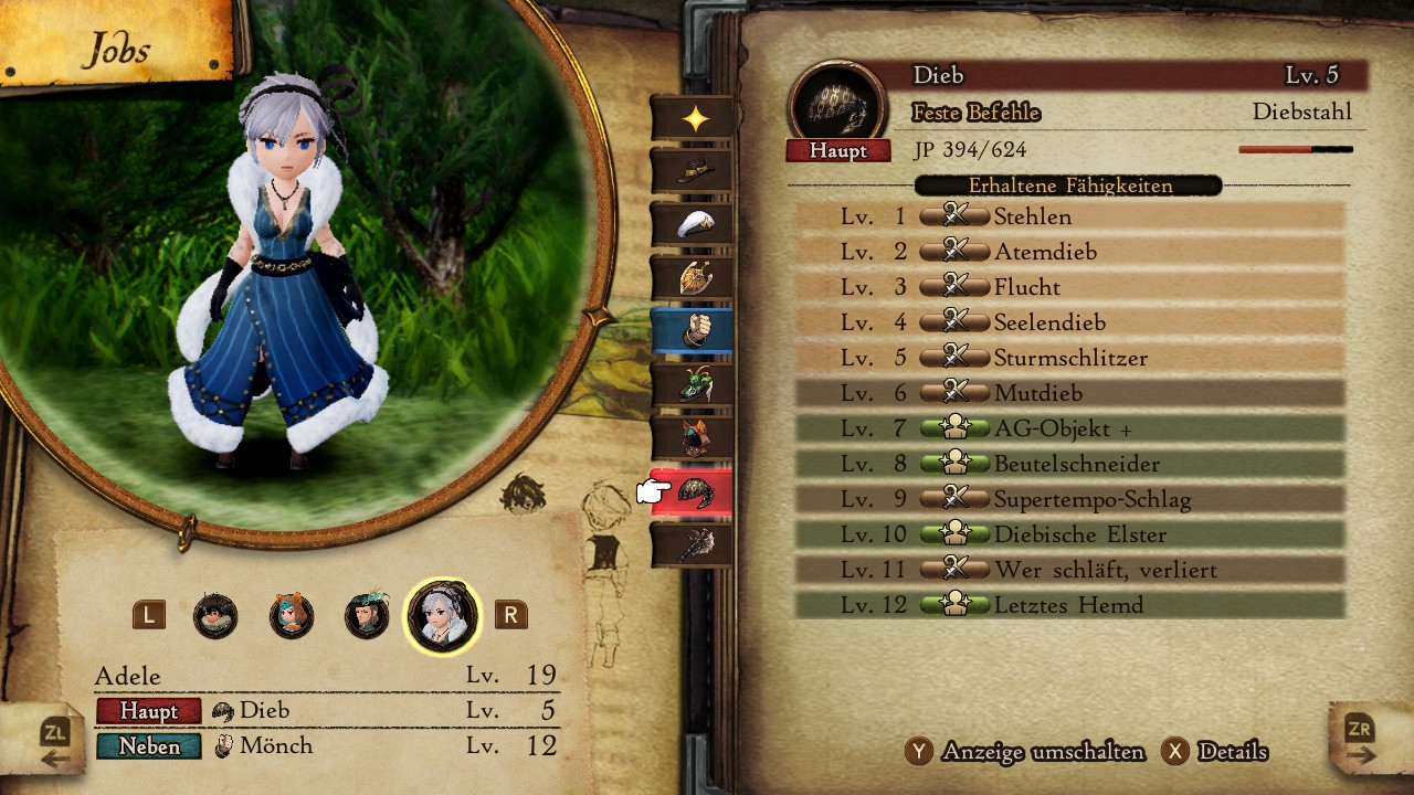 Und wo ich schon beim Thema „spaßig umgesetzt“ bin: Auch das Spiel mit den Jobklassen macht nach wie vor Laune. Klar wollen die Bosse idealerweise mit bestimmten Konfigurationen geplättet werden, doch insgesamt bietet Bravely Default II mächtig Freiraum zum Experimentieren – zumal jeder Sieg über einen Asterisk-Träger eine neue Klasse zum Ausprobieren einbringt. Werden zu Beginn lediglich Basisbedürfnisse mit dem klassischen Ritter bzw. „Vorkämpfer“, dem mit Angriffsmagie hantierenden Schwarzmagier oder dem unterstützenden Weißmagier gedeckt, gesellen sich später esoterischere Jobs mit spezielleren Fähigkeiten zur Auswahl hinzu und ermöglichen völlig neue Strategien. Ferner lassen sich erlernte passive Fähigkeiten frei kombinieren und sogar Sub-Jobs zuweisen, damit ihr auch Aktions-Skills ausgelernter Klassen weiter nutzen könnt. Definitiv eine der großen Stärken, wenn nicht sogar DIE größte Stärke des Spiels.