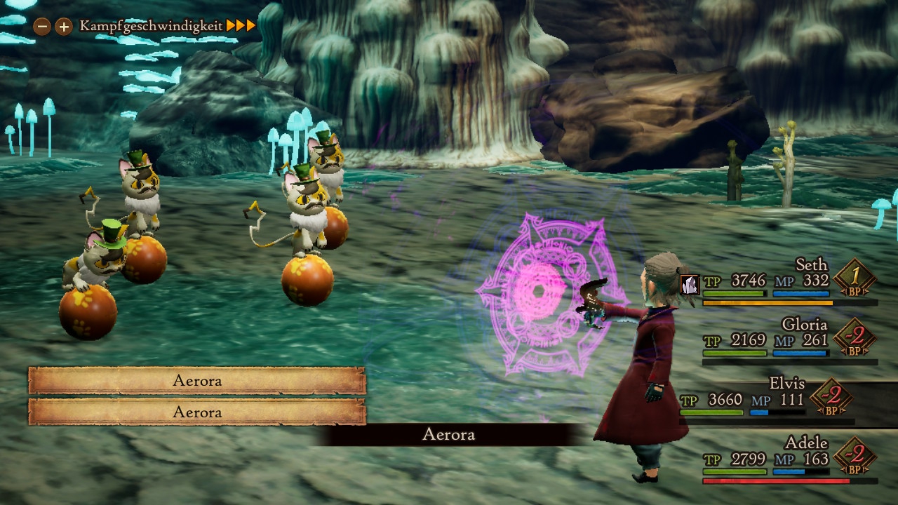 Das Kampfsystem selbst wurde ebenfalls umgekrempelt. Statt nun pro Runde Aktionen für all eure Gefährten einzugeben und diese dann gemäß der Werte von Freund und Feind in einem Rutsch abspulen zu lassen, kommt jeder Streiter einzeln zum Zuge. Das erlaubt euch natürlich, bei unerwarteten Ereignissen schneller und direkter einzugreifen, allerdings verschweigt Bravely Default II, wer genau wann an der Reihe ist. Theoretisch sollen sich auffüllende Balken bei euren Team-Informationen sowie Warnsignale bei Gegnern darüber Auskunft geben, wie die Zugreihenfolge ungefähr aussieht. Bei größeren Diskrepanzen im Tempo-Wert aller Teilnehmer halfen mir diese Informationen jedoch praktisch gar nicht. Das ist ärgerlich und erschwerte mir in vielen Fällen enorm die Zugplanung – gerade bei den Duellen mit den Asterisk-Trägern, die immens kniffliger ausfallen als die Fights mit der vielfältigen Monsterschar von Excillant.