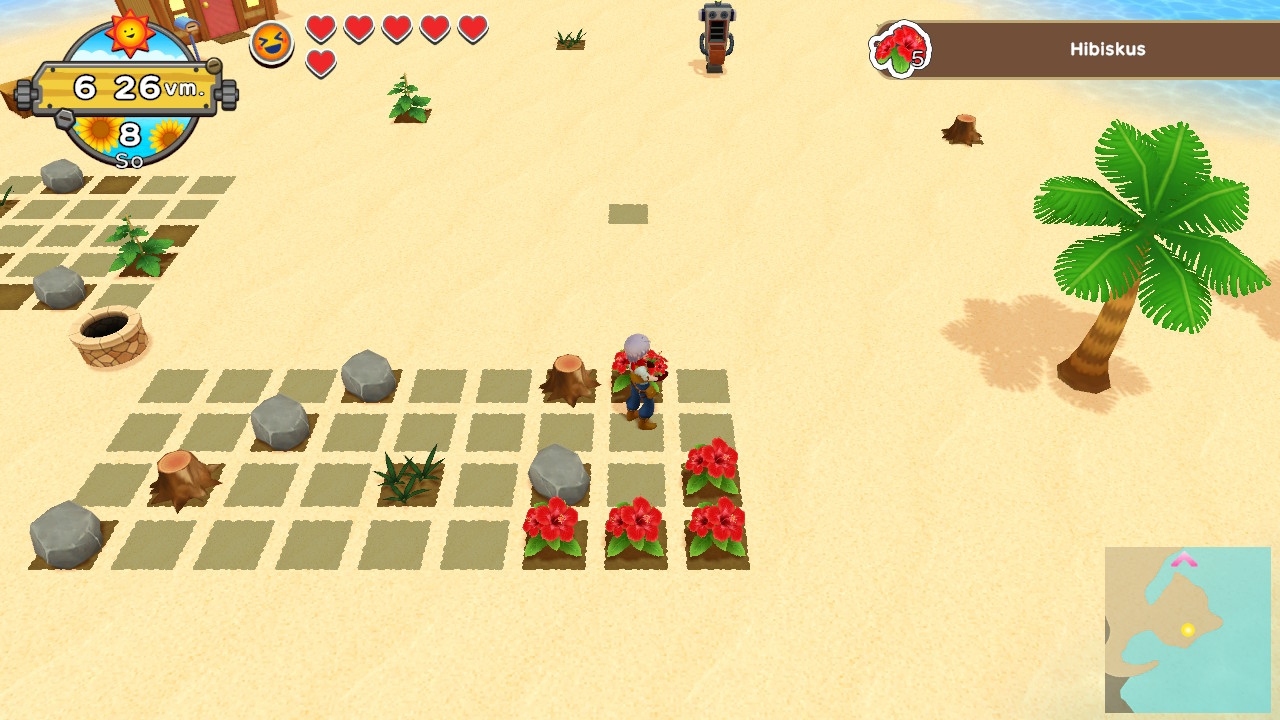 Doch Moment, bei Harvest Moon wird schließlich immer noch Landwirtschaft betrieben! Die geht Natsume-gemäß eingängig von der Hand: Alle Aktionen wie das Pflügen der Felder und Gießen von Pflanzen werden simpel und einfach mit der kontextsensitiven A-Taste ohne großes Inventargefummel erledigt und wo ihr etwas anbauen könnt, ist vom Spiel fest vorgegeben. Die Eine Welt bietet jedoch nicht nur einen Hof. Dank einer Erfindung des eingangs erwähnten Doc Jr. lässt sich die Farm nämlich komprimieren und an einen anderen Ort verlegen. Wollt ihr beispielsweise lieber vom Wiesenland in die Wüste, um dort besondere Rosen anzubauen, könnt ihr sprichwörtlich die Koffer packen und geschwind umziehen. Theoretisch ist dies eigentlich sogar nicht einmal notwendig, da jede Stadt sowie euer eigener Hof einen Schnellreisepunkt darstellt und ihr somit selbst abseits eurer Quartiere Felder pflegen könnt. Praktisch bleibt zumindest der nette Touch, dass man sich an seinem Lieblingsort niederlassen kann.