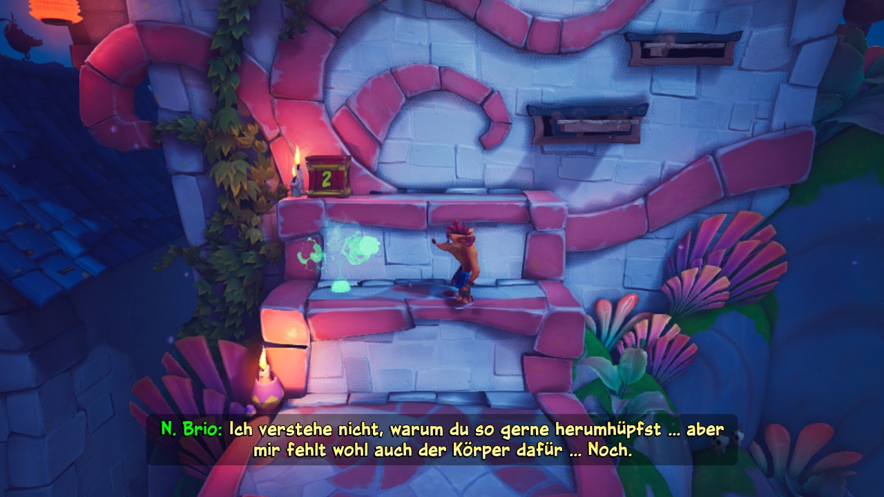 Der neue Teil 4 (Der Zorn des Cortex vergessen wir mal flugs) knüpft direkt an das Ende von Crash Bandicoot 3 an: Oberschurken Dr. Neo Cortex und N. Tropy entkommen mit Hilfe der bösen Maske Uka-Uka ihrem Dimensionsgefängnis, krallen sich die mächtigen Quantum-Masken und zersplittern das allgemeine Dimensionsgefüge. Ehrensache, dass der professionelle Kistenzerbrecher Crash mit Unterstützung seiner Schwester Coco dem Einhalt gebieten will – auch wenn es einen kleinen Anstupser von Seiten der guten Zaubermaske Aku-Aku benötigt. Die Story bleibt dabei genregemäß simpel, wird dafür immerhin unterhaltsam erzählt. Die verspielt animierten Zwischensequenzen, bei denen Crash etwa eine Parallelwelt-Tawna von allen Bildschirmseiten aus cartoonhaft anstupst, bis sie ihm entnervt eins auf den Deckel gibt und direkt augenzwinkernd in Richtung Coco schnipst, waren für mich ein eindeutiges Highlight des rund achtstündigen Plattformer-Abenteuers.