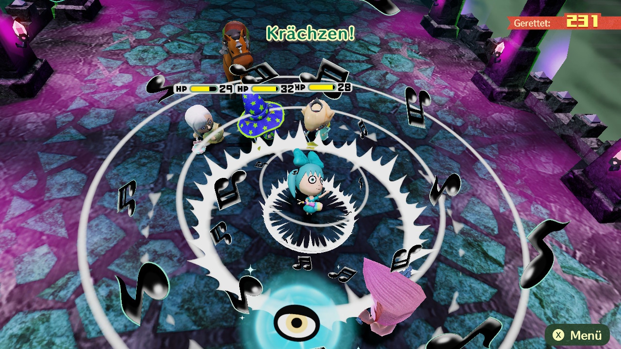 Immerhin merkt man dem Titel allein optisch nicht an, dass er ursprünglich für den 3DS erschienen ist. Die farbenfrohen Umgebungen wirken detailliert und selbst die Charaktere haben dank überarbeiteter Texturen ein sichtbares Upgrade erfahren. Und zumindest in einem Punkt muss ich gestehen, dass ich mit dem 3DS-Original zu hart ins Gericht gegangen bin. Der Soundtrack ist nämlich tatsächlich ziemlich gut und allem voran abwechslungsreich. Jedes Gebiet wartet nicht nur mit eigener Kennmelodie auf, sondern bietet gar unterschiedliche Kampfstücke. Das ist ein Aufwand, den nicht viele Rollenspiele betreiben! Sprachausgabe – ob „richtige“ oder die Tomodachi Life-Robostimmen – gibt es hingegen auch dieses Mal nicht. Wobei ich mir nicht sicher bin, ob diese das Spielerlebnis wirklich aufgewertet hätte.