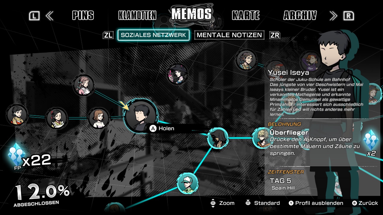 Was die Nebenquests anbelangt, belässt es Neo: The World Ends with You hingegen bei einem sehr oberflächlichen und simplen System. So erfordert keine der optionalen Missionen irgendwelche komplizierten Aktionen. In der Regel schaltet ihr schlichtweg direkt anwesende Gegner aus oder sucht einen gewünschten Gegenstand im selben Gebiet und schon ist die Sache gegessen. Interessante Erzählungen, wie sie etwa in den Yakuza-Spielen von Sega auftreten, dürft ihr hier nicht erwarten. Schade, hätte man doch aus dieser Stelle mehr aus den Persönlichkeiten Shibuyas herausholen können. Ignorieren solltet ihr die kleinen Zusatzaufgaben trotzdem nicht, bringen sie doch nicht nur häufig nützliche Pins oder zumindest etwas Geld ein, sondern legen auch einen neuen Verknüpfungsknoten in Rindos sozialem Netzwerk frei. Dabei handelt es sich um eine massive Liste an freischaltbaren Extras, die von erweiterten Menüs in den Restaurants über Eintausch-Pins bis hin zu waschechten Spielfeatures wie andere Schwierigkeitsgrade reichen. Die dafür notwendigen Freundschaftspunkte verdient ihr sowohl im Storyverlauf als auch durch eure Leistungen in speziellen Kettenkämpfen.