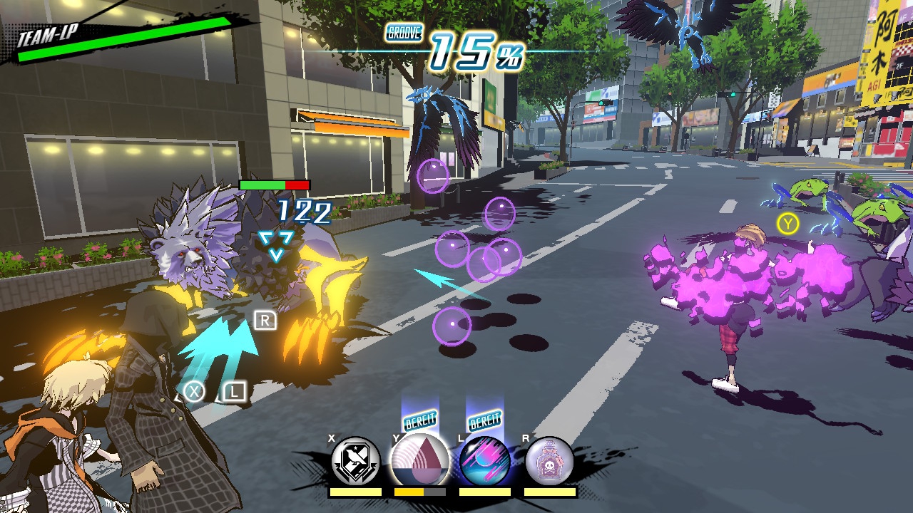 Jetzt habe ich bereits von Pins und Kämpfen gesprochen, doch wie läuft das eigentlich ab und was hat das eine mit dem anderen zu tun? Nun, die Teilnehmer des Spiels der Reaper verfügen über die Gabe, ihre Umgebung zu scannen – also den verborgenen Geräuschen der Stadt zu lauschen. Einerseits lesen sie auf diese Weise die Gedanken von Passanten, die in der Regel äußerst amüsant, aber nicht von essenzieller Bedeutung sind, andererseits machen sie so Noise ausfindig. Das materialisierte Rauschen manifestiert sich in Monstergruppen, die ihr in Echtzeitkämpfen von der Bildfläche fegt. Interessant dadurch: Die Gefechte auf der Oberwelt bleiben weitestgehend optional, wenngleich ihr zwecks Level-Ups und Nahrungsboni natürlich trotzdem regelmäßig in den Ring steigen solltet. Jedem Gruppenmitglied weist ihr dabei einen Anstecker zu, der diesem bestimmte Kräfte verleiht. Von Feuerwirbeln über Blitzkugeln bis hin zu Hochgeschwindigkeitstritten ist alles dabei, was das Herz begehrt. Wichtig ist jedoch, dass jede Fähigkeit auch einer bestimmten Taste zugeordnet ist. So sind schnelle Projektile normalerweise auf Y daheim, während Ladeangriffe wie beispielsweise Bomben auf den Schultertasten liegen. Zu Beginn dürfen sich die Kommandos nicht überschneiden, später schaltet ihr jedoch die Möglichkeit dazu frei. Trotzdem empfand ich es als effizienter, möglichst verschiedene Pinfähigkeiten ins Gefecht zu nehmen und die Feindesscharen mit fiesen Kombos zu drangsalieren. Speziell im späteren Verlauf, wenn euch die volle Pin-Palette potenziell zur Verfügung steht, können hierbei auch Moves mit mordmäßigem Fingerverknotpotenzial herauskommen – ganz wie man es vom DS kennt!