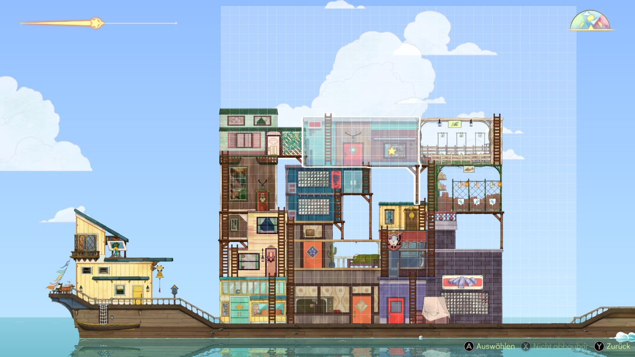 Nach ein paar weiteren Einleitungsaufgaben seid ihr dabei im Prinzip vollkommen auf euch allein gestellt. In der Kapitänskajüte bestimmt ihr euer nächstes Reiseziel, auf das der Kahn direkt zuschippert. Symbole und andere Markierungen weisen dabei auf mögliche Ereignisse hin, die auch mal als Minigame enden: So könnt ihr beispielsweise auf einen Schwarm Quallen treffen und von diesen Gelee und als Geldmittel fungierende Glims gewinnen oder während eines Gewitters Blitze in Flaschen abfüllen. All dies erfordert von euch geschicktes Hüpfen an Deck, wobei eure zuvor platzierten Bauten – dazu später mehr – als Plattformen dienen. Abseits davon gibt es natürlich noch eine Hand voll Beschäftigungsmöglichkeiten, um die Reisezeit zum Ziel, die sich erst im Spielverlauf durch Upgrades und Schnellreisebushaltestellen verkürzen lässt, zumindest produktiv zu nutzen. Sei es der Anbau von Gemüse, das Flechten von Garn oder auch einfach eine entspannte Angelrunde am Heck: An Abwechslung mangelt es nicht. Wenn man von allem während der Reise ein wenig macht, kommt man zudem erstaunlich selten in die Bedrängnis, mal für die Hauptaufgabe notwendige Gegenstände zu vermissen. Vorausgesetzt natürlich, man ist auch bei den Erkundungen fleißig. Diverse Rohstoffe müssen nicht selten erst auf unterschiedlichen Inseln abgebaut oder erworben werden und vielerorts kommt ihr erst weiter, wenn ihr entweder Stellas Fähigkeiten an Schreinen erweitert oder euer Schiff aufgerüstet habt. Allein der stetige Warenkreislauf, mitsamt ergänzender aus Schiffswracks hebbarer Schätze und anderen Nettigkeiten, sorgt bereits für einen ungemein sogartigen Spielfluss, dem ich mich schnell nur schwer entziehen konnte.