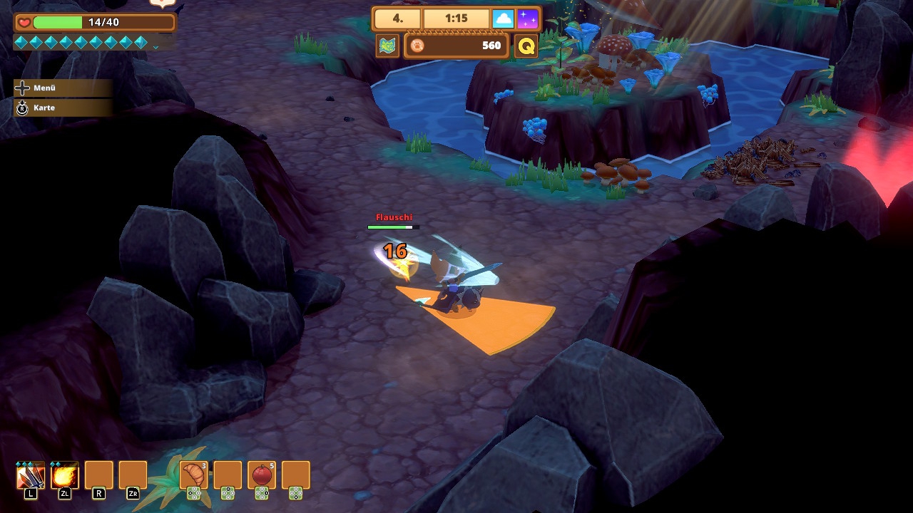 Die Switch-Umsetzung von Kitaria Fables ist im großen und ganzen gelungen. Die stilisierte Optik geizt nicht mit Umgebungsdetails und bietet dichte Waldgegenden, sengende Wüstensande und wohlig-winterliche Bergregionen. Leider geht die Pracht beizeiten zu Lasten der Performance, im von mir ausschließlich gespielten Handheldmodus vernahm ich diverse Ruckler – gerade während hitzigerer Gefechte. Immerhin bleiben die Ladezeiten dafür auf einem angenehmen Niveau. Was jedoch speziell auf der Switch Lite nicht geht, ist die Schriftgröße. Selbst auf der größten der drei Schriftstufen habe ich teils meine liebe Müh, einige Beschreibungstexte zu entziffern oder gar zu erkennen, wie viele Einheiten eines bestimmten Gegenstandes gerade in meinem Inventar sitzen. Es erinnerte mich in der Hinsicht negativ daran, wie ich die PS4-Version von Stardew Valley via Remote Play auf meiner Vita spielte. Dass es dann bei Questupdates dank der großen Meldungen trotzdem zu unschönen Überlagerungen mit Dialogboxen kommt, setzt dem ganzen noch die Krone auf.