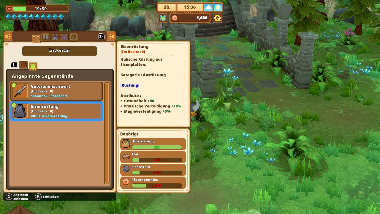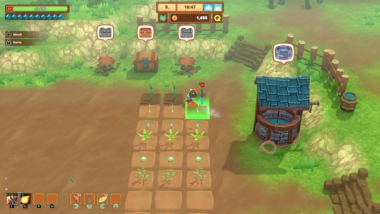 Der landwirtschaftliche Aspekt fühlt sich insgesamt leider auch ziemlich oberflächlich an. Klar können die Werkzeuge zum Zwecke der Effizienz aufgemotzt werden, doch im Prinzip dient der ganze Aufwand um Kohl, Erdbeeren und Weizen primär der simplen Geldgewinnung oder dem Tausch gegen anständige Nahrungsmittel zwecks Trefferpunkt-Regeneration und temporärer Stärkungen. Klar, das ist bei Rune Factory und Story of Seasons nicht unbedingt anders, besagte Spiele haben jedoch den Lebenssimulationsaspekt, um das aufzuwiegen – und dieser fehlt Kitaria Fables. Die überschaubare Anwohnerschaft führt kein merklich organisiertes Leben, die Tage schreiten ohne bedeutende Auswirkungen voran. Eine Hand voll Ereignisse sind zwar von der Tagnummer abhängig, insgesamt geht der Zähler jedoch nur munter hoch. Sind also alle Storyereignisse abgeschlossen und die Nebenaufgaben erledigt – was zugegebenermaßen schon seine Zeit dauert – bleibt nicht mehr viel über, für das ich mich wieder zum Spielen motiviert fühle.