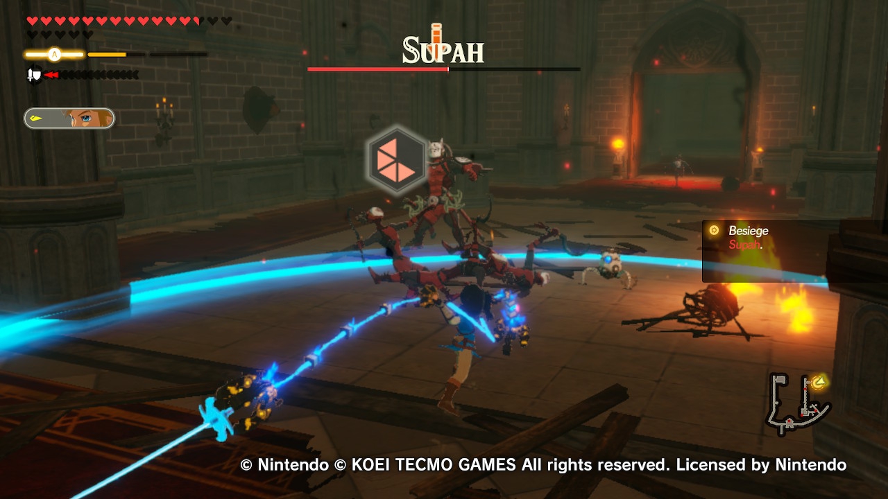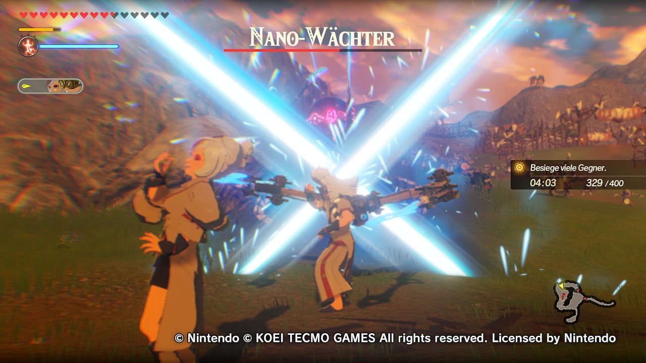 Und das ist schade, denn auf der anderen Seite lockt ein ziemlich stattlicher Lohn. So gibt es endlich eine Möglichkeit, die gesundheitswiederherstellenden Äpfel zunächst teuer, später preiswerter vor Schlachtbeginn zu erwerben. Ferner lässt sich das Waffenlager erweitern und die Stärke der Shiekahmodule erhöhen. Viel wichtiger sind jedoch die neuen Werkzeuge: Links Doppelklauen verleihen dem hylianischen Gardisten ein vielfältiges, schnelles Manöverset, welches dank der Spezialaktion sogar ein wenig Abwechslung reinbringt. So kann er nämlich auf Knopfdruck bestimmte Bewaffnungsarten kopieren und so vorübergehend Großschwerter, Lanzen oder Keulen herumschwingen, bis sie zerbrechen – ganz wie man es von Breath of the Wild kennt. Zelda darf sich ebenfalls über ein neues Spielzeug freuen, welches passenderweise auch schon schon im Breath of the Wild DLC war: Das Motorrad Eponator. Tierisch schnell, extrem knifflig unter Kontrolle zu behalten und trotzdem wahnwitzig cool. Es war mir eine absolute Freude, mit Zelda irrsinnige Stunts aufs Parkett zu legen und dabei die Bokoblinscharen umzuhauen, auch wenn ich angesichts des hohen Tempos – das sich per Spezialaktion noch einmal erhöhen lässt – nicht immer ganz auf dem Schirm hatte, was eigentlich abläuft.