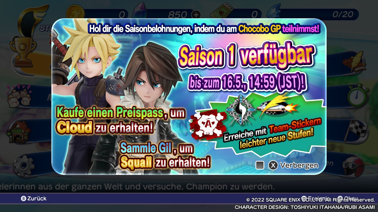 Stichwort Shop: Aufmerksame Naturen werden bemerkt haben, dass ich nebst Mithril zwei weitere Währungen erwähnte. Die Tickets sind die einzigen Objekte, die ihr rein durchs Spielen erbeutet – sei es durch das Sammeln von Kristallen während eines Rennen, das Abschließen von Story-Herausforderungen oder Bestehen von Serienrennen. Gewisse Charaktere und alle aus der Geschichte freischaltbaren Fahrzeuge müssen mit Tickets erworben werden, bevor ihr sie tatsächlich nutzen dürft. Ferner gibt es noch alternative Farbvarianten, eine kleine Auswahl an Stickern sowie Hauptmenü-Hintergründe zu erwerben. Ganz normaler Stoff also, auch wenn es auf Dauer mühsam wird, die dafür notwendigen Tickets zusammenzukratzen. Gil wiederum ist eine andere perfide Währung. Technisch gesehen könnt ihr sie nicht mit Echtgeld kaufen, sondern müsst sie euch erspielen. Praktisch zahlen die dafür zu erfüllenden täglichen und wöchentlichen Missionen dermaßen schlecht, dass man an anderer Stelle zum Zahlen gezwungen wird – nämlich für den Premium-Preispass. Dieser schüttet reichlich Gil aus und macht das Ansammeln der aktuell für Squall aus Final Fantasy VIII notwendigen 3.000 Gil zum Kinderspiel. Und da dessen Extra-Fahrzeuge je 9.000 Gil kosten und zu allem Überfluss der Gil-Shop sein Sortiment am Ende der Saison ändert, erklärt Square indirekt den Premium-Pass zum Pflichtkauf. Rein wirtschaftlich gesehen mag ich die Monetarisierung vielleicht noch einigermaßen nachvollziehen können, sofern im Gegenzug auch stetig neuer Content geliefert wird, doch die Holzhammer-Implementierung sowie die Tatsache, dass es sich hierbei um ein 50-Euro-Spiel mit einer mutmaßlich jüngeren Zielgruppe handelt, stößt bei mir nur auf verständnisloses Kopfschütteln.
