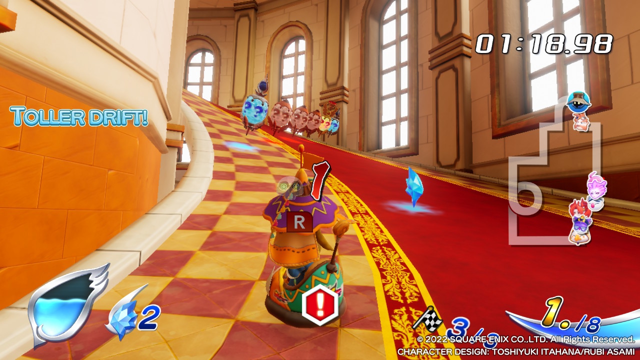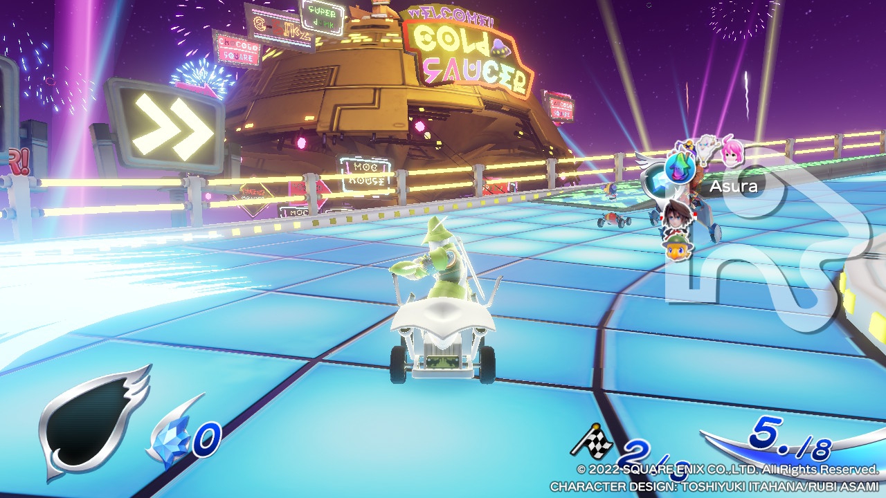 Wer mit Mario Kart vertraut ist, wird bei den grundlegenden Rennmechaniken von Chocobo GP sofort diverse Parallelen bemerken. Drei Runden lang rast ihr durch kunterbunte Kurse, die in Teilen Final Fantasy-Gebieten wie der verregneten Stadt Zozo aus Final Fantasy VI nachempfunden sind, und mogelt euch dabei sowohl mit euren Fahrkünsten als auch mit etwas Item-Hilfe an die Spitzenposition. Mit der R-Taste lässt sich dabei ein Drift einleiten, der je nach Zeitdauer der Schlitterei in einem stärkeren Boost resultiert, außerdem können an Rampen mit der selben Taste Tricks vollführt werden, die ebenfalls einen Schub verleihen. Blaue Kristallen dienen dazu, euer Tempo zu erhöhen und bis zu zehn von ihnen könnt ihr gleichzeitig bunkern – ganz wie die Münzen von Mario Kart. Rast ihr in die auf den Strecken verteilten Magie-Eier, erhaltet ihr einen zufälligen Maginiten – die Zaubersteine von Chocobo GP und somit effektiv die Items. Feuermagie schießt etwa einen Feuerball nach vorn oder hinten, während ihr mit Hast kurzzeitig schneller werdet oder per Todesurteil einem Kontrahenten mit einem kurzen Fahrstopp droht, wenn dieser den Sensenmann nicht per Sprungmarathon rechtzeitig abschütteln kann.