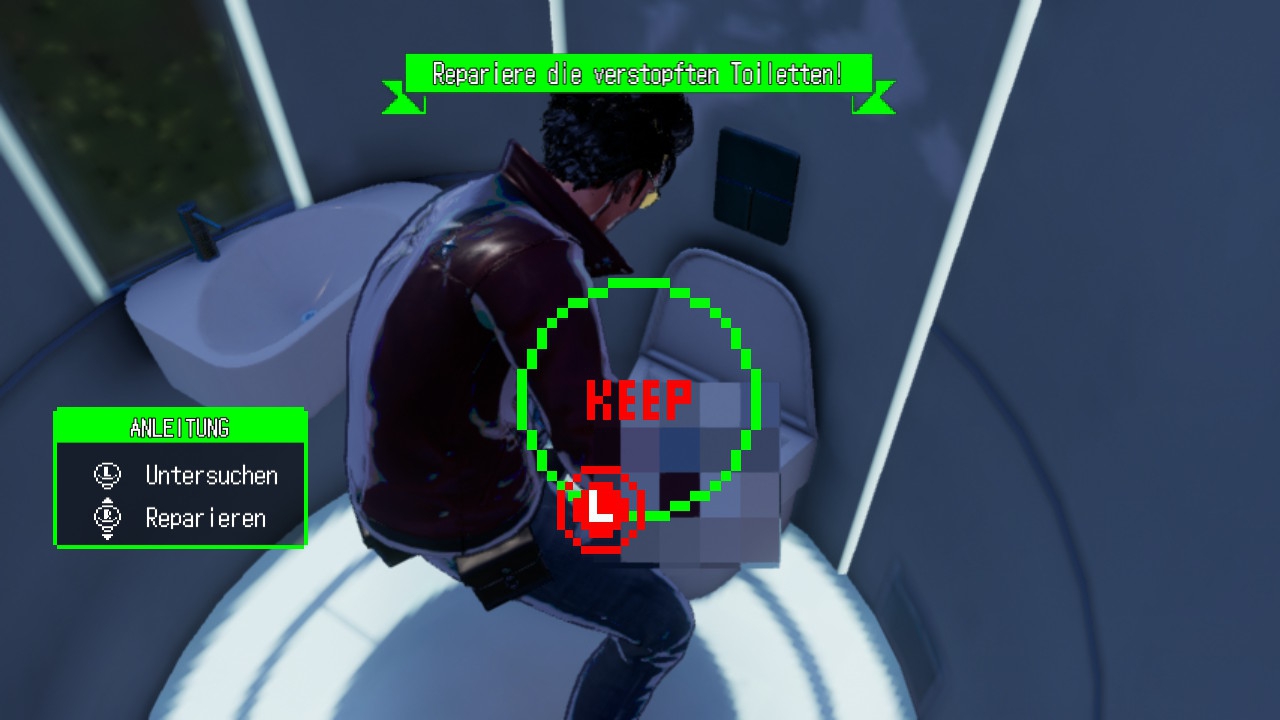 Auch andere Beschäftigungen wie den Rasen mähen, Sammelkarten ausfindig machen, Skorpione sammeln oder Missionen für ein modebewusstes T-Shirt-Alien erledigen machen Laune und sind an kreativer Energie nicht zu überbieten. Spätestens nach dem fünfzigsten reparierten Klo wird es allerdings auch dezent nervig. Ihr müsst nämlich, um den Fortschritt speichern zu können, mit Travis ein stilles Örtchen aufsuchen, die, wie es der Zufall so will, aber in der gesamten Stadt verstopft sind. So kommt es also vor, dass man teils mehr den Pömpel als das Schwert schwingt. Auch der Rest der offenen Areale lässt stark zu wünschen übrig. Was No More Heroes 3 an manchen Stellen optisch auf die Bühne bringt, wird hier mit einer höllischen Framerate, extrem vermanschten Texturen und einer komischen Motorradsteuerung wieder zunichte gemacht. Dafür haut der Soundtrack an jeder Ecke rein und sorgt somit zumindest klanglich für gute Unterhaltung.