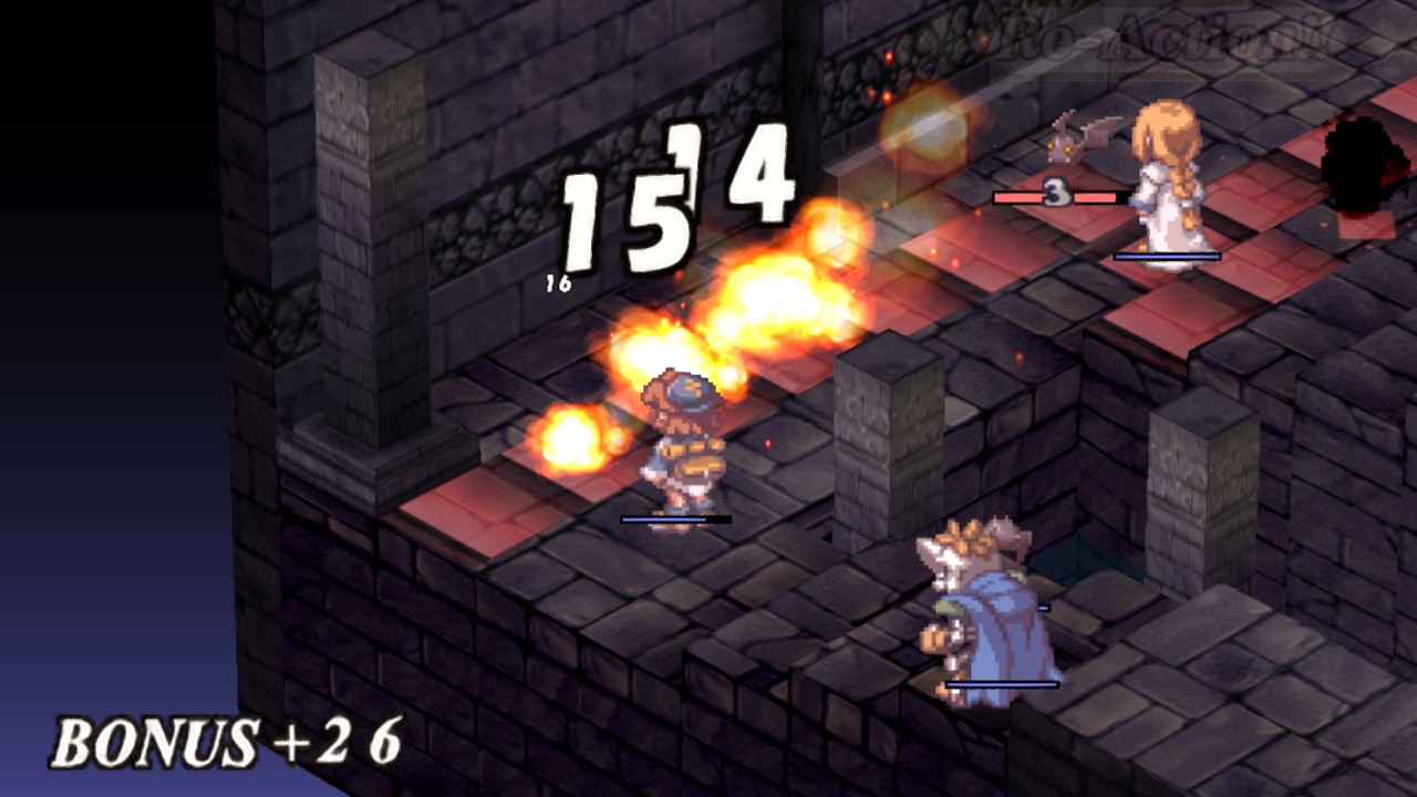 Wo ich vorhin schon die unterschiedlichen Erfahrungspunkte angeschnitten habe: La Pucelle auch bereits diverse Möglichkeiten zur Anpassung eurer Charaktere. So kann eure Ausrüstung nicht nur von den Grundwerten her verstärkt werden, sie kann je nach Merkmalen die Attribute der Figuren dauerhaft stärken, wodurch der Trupp auch neue Fähigkeiten lernt. Das gilt auch für Monstereinheiten, die in diesem Fall direkt vom Schlachtfeld rekrutiert werden – ein paar Läuterungsrunden sowie eine gehörige Tracht Prügel machen’s möglich. Das ist alles bei weitem nicht so tiefgründig und ineinander verzahnt wie bei späteren Disgaea-Spielen, macht jedoch auch bereits in dieser simpleren Form enorm Laune und motiviert ungemein.