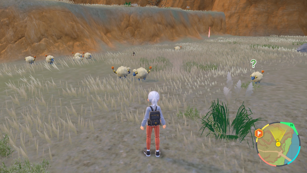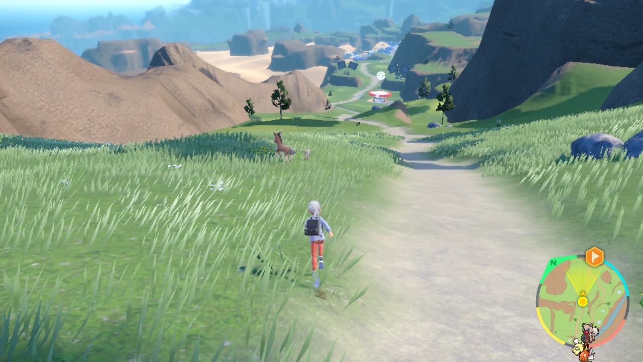 Doch wie läuft nun eigentlich die Erkundung Paldeas? Im Grunde genommen ähnlich wie in Pokémon Legenden, allerdings mit teils eingeschränkten oder ausgetauschten Optionen. Zunächst einmal ist die Region zwar immer noch in offensichtliche Biome unterteilt, dafür jedoch nahtlos begehbar. Ladebildschirme gibt es nur bei Schnellreisen und Betreten von geschlossenen Räumlichkeiten. Auch seid ihr nicht auf stark eingeschränkte Wege begrenzt, sondern könnt munter über die weitläufigen Wiesen, erhöhten Berghänge oder durch die tiefen Schluchten wandern. Springen darf eure Figur zwar nicht, dafür ist jedoch euer im Laufe des Intros erbeutetes Reit-Pokémon da. Jepp, Pokémon Karmesin und Purpur drücken euch das Taschenmonster auf dem Cover praktisch direkt zu Spielbeginn in die Hand – es ist jedoch nicht von Beginn an kampffähig, sondern dient eben als reitbarer Untersatz. Vom Rücken der Riesen übersah ich jedoch nur zu gern die herumlaufenden Pokémon und gerade über kleinere Racker wie beispielsweise durch den Boden buddelnden Digda stellten mir nicht selten ein sprichwörtliches Bein. Das schiebe ich jedoch mehr auf meine mangelnde Weitsicht als auf die Pokémon-Dichte des Spiels, die insgesamt eine angenehme Balance zwischen „weniger bevölkert“ und „dicht an dicht“ schafft.