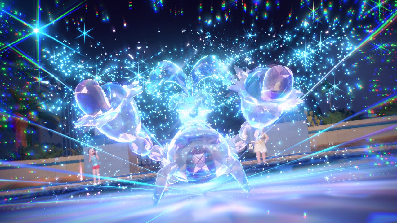 Aber Moment, da gibt es doch noch eine weitere Änderung im Kampfsystem! Ja, ihr glaubt doch wohl nicht, dass ich die Terakristallisierung sowie die Tera-Raids vergessen hätte! Die ersetzen die aus Pokémon Schwert und Schild bekannten Dynamax-Elemente, verfeinern sie jedoch in gewissen Punkten. So ist die Terakristallisierung nicht auf bestimmte Situationen beschränkt, sondern kann in jedem beliebigen Kampf mit jedem Pokémon ausgeführt werden. Anders als bei den Megaentwicklungen aus X, Y, Sonne und Mond ist die Nutzung allerdings auch nicht auf ein Mal pro Kampf, sondern auf ein Mal pro Besuch im Pokémon Center beschränkt. Auch ist der Nutzen bedeutend eingegrenzt: Die kristallene Form verstärkt nur Attacken eines bestimmten Typs und der ist bei jedem Pokémon vorgeschrieben. Es gibt aber natürlich Möglichkeiten, diese Typen mit etwas Fleißarbeit zu ändern – oder gar Varianten zu fangen, die von vornherein ein anderes Element innehaben. Die werden entweder als Leuchtsäulen auf dem Feld oder über Tera-Raids erbeutet. Die Raid-Kämpfe funktionieren dabei grob wie in Schwert und Schild: Vier Leute ziehen gegen ein Groß-Pokémon in den Kampf, wobei ihr die Mitstreiter entweder von NPCs besetzen lasst oder über die Multiplayer-Option lokal bzw. online ins Boot holt. Dankenswerterweise wurden die Raid-Kämpfe enorm beschleunigt, weswegen sie nun nicht mehr wie eine Geduldsprobe wirken. Umgekehrt ist es jedoch für mich schwierig gewesen, den Verlauf der Schlachten überhaupt anständig zu erkennen, einfach weil aus allen Rohren Attacken im Akkord abgefeuert werden. Man kann eben nicht alles haben, ich ziehe dies jedoch zweifelsfrei der vorherigen Umsetzung vor.