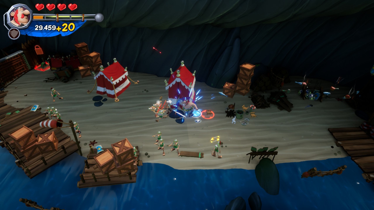 Stichwort Abwechslung: Zumindest drei der Level versuchen, das gleichströmige Spielerlebnis ein wenig aufzulockern. So müsst ihr etwa im Dorf Drogheda durch Aufdecken von Hinweisen eure Zielperson ausmachen, während die hibernischen Spiele mit kleinen Zielschuss-Minigames aufwarten. Die andere Hälfte folgt jedoch dem immergleichen Schema, das aufgrund der häufigen ereignislosen Korridore schlichtweg schlaucht. Am Ende eines jeden Levels wartet zudem ein Römerlager auf euch, das nach dem Highscore-Prinzip funktioniert. Ihr sollt also möglichst schnell möglichst effizient durch die Arenen wüten und dabei auch ein stufenspezifisches Sonderziel erledigen. Für die Bestwertung müsst ihr zudem mehr auf eure Lebensenergie achten als sonst. In allen anderen Situationen werdet ihr im Solo-Modus lediglich an den letzten Checkpoint zurückverfrachtet oder könnt in Koop-Partien von euren Freunden mit etwas leckerem Essen wiederbelebt werden. Das war mal anders: Bei Release gab es noch kein Game Over, was vor allem die zwei einzigen Bosskämpfe des Spiels mit ihren mehrminütigen Gegnerwellen enorm langweilig machte. Im jetzigen Zustand sind die Ausweichphasen für meinen Geschmack zwar immer noch dezent zu lang, aber zumindest muss ich Asterix bzw. Obelix nun bewegen, wenn ich das Ende sehen möchte. Und wo ich das Thema Koop schon anschneide: Ihr könnt hier mit bis zu vier Spielern zugleich an der selben Konsole durch Hibernia fegen. Online geht hier jedoch leider nichts und spielbar sind nur Asterix und Obelix, Spieler 3 und 4 müssen mit lieblosen Klonen der Titelcharakteren losziehen.