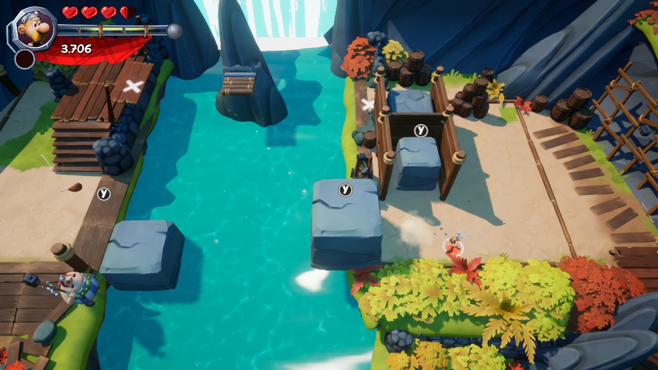 Während bis hierhin alles auf ein leicht verdauliches und mit rund drei Stunden recht kompaktes Abenteuer hindeutet, war Asterix & Obelix XXXL zum Launch jedoch in vielerlei Hinsicht eine unfertige Frechheit. Es litt im Handheld-Modus verstärkt unter Rucklern, es fehlten Animationen, Soundeffekte und Reaktionen, die Gallier blieben alle Nase lang an irgendwelchen Kisten und in der Umgebung hängen … Das war kein Spaß. Zu meinem großen Erstaunen wurden diese Fehler jedoch fast komplett behoben. Klar machen sich immer noch ein paar Ruckler bemerkbar, die sind aber nun bedeutend seltener. Schritte ins tiefe Gewässer werden mit Energieabzug und Soundeffekten quittiert, es gibt unterschiedliche Klänge für die als Mehrzweckwaffe dienenden Gebrauchsobjekte, Römer verschwinden nun in einer comichaften Wolke, anstatt bei Bodenkontakt schmucklos ausgeblendet zu werden und noch mehr. Sogar ein Titelbildschirm wurde erst jetzt mit dem jüngsten Update nachgeliefert! Das mag nach wenigen unwichtigen Details klingen, doch glaubt mir: Im laufenden Spiel fiel mir sowas direkt auf und ließ eindeutig etwas vermissen. Schaut ruhig in den unten eingebundenen Gameplay-Mitschnitt, der noch aus der Launchversion stammt, und macht euch ein eigenes Bild! Nun kommt zusammen mit der schon vom Start weg soliden Optik sowie den lockeren, gelungen auf Deutsch eingesprochenen Unterhaltungen zwischen Asterix, Obelix und ihren Begleitern angenehme Comic-Atmosphäre auf.