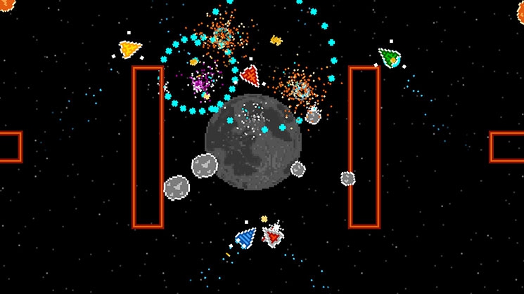 Nein, das kann nun echt nicht möglich sein. Immerhin spielt der brutale Shooter-Hit auf der Erde und dreht sich um ein dubioses Gangsterkartell. Man kann aber nicht verneinen, dass Astro Duel Deluxe gewisse positive Anleihen aus der Hotline Miami-Reihe hat. Am auffälligsten ist da wohl der grandiose Soundtrack. Neben dem ohnehin schon extrem spaßigen Gameplay sorgen die genialen Tracks nur für noch mehr Schwung in den hitzigen Partien. Die abwechslungsreichen Maps reihen sich ebenfalls positiv mit ein. Mal hat man gegen ein störendes Gravitationsfeld zu steuern oder man muss sich in Acht nehmen, nicht in die nächste Laserbarriere zu donnern. Aber auch ganz klassische Battle-Maps sind mit an Bord.