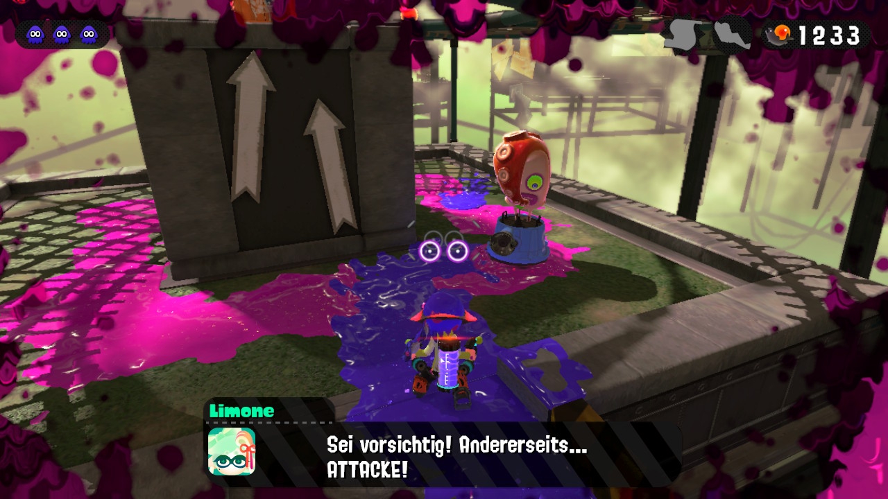 Doch das ist irgendwie auch der Reiz des Heldenmodus'. Im Prinzip handelt es sich hier um ein ausgeklügelt designtes Tutorial für die große Haupt-Attraktion: Die Online-Modi. Doch Nintendo hat deutlich mehr daraus gemacht und eine vollwertige Einzelspieler-Erfahrung zusammengestellt, die einiges an Geschick abverlangt, ohne zu überfordern. Und diese Eingewöhnung habe ich doch gebraucht, denn die verlegte Sprungtaste im Vergleich zum Wii U-Vorgänger – jetzt wird mit B anstelle von X gehüpft – sowie die kleinen Detailanpassungen bei den Waffen wollen definitiv erst einmal gelernt werden. Außerdem habe ich für mich festgestellt, dass der Handheld-Betrieb sich bei aktiver Bewegungssteuerung ein wenig ungemütlich anfühlt. Zwar bin ich beileibe kein Feind der Motion Controls und bevorzuge die Neigungseingaben sogar, weil ich als eher unterdurchschnittlicher Shooter-Spieler so besser zielen kann, doch wenn dabei auch der Bildschirm mitgeht, verliere ich schnell den Überblick. Womöglich liegt es daran, dass für Splatoon 2 viele schnelle Bewegungen nötig sind. Jedenfalls bin ich recht schnell auf den Tabletop- beziehungsweise TV-Modus umgestiegen.