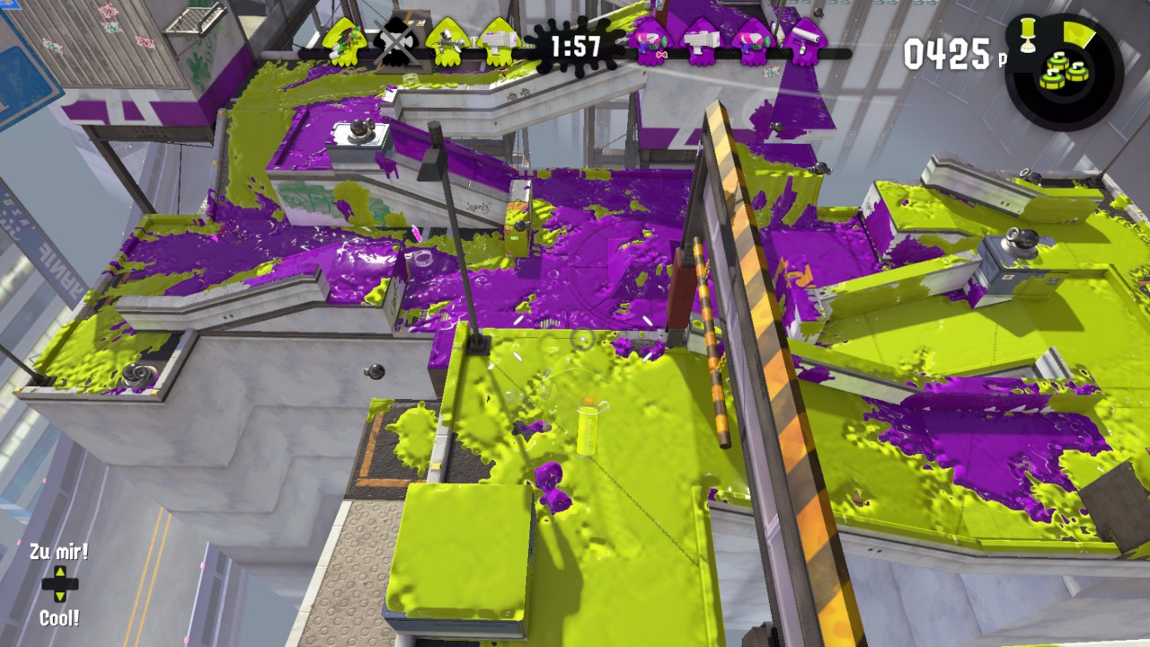 In technischer Hinsicht gibt sich Splatoon 2 nur wenige Blößen. Die stilsichere Optik mit ihrem urbanen Touch gefällt sofort, bei den actionreichen Revierkämpfen zeigen sich die Farbkleckse allesamt von ihrer besten Seite – zumindest wenn man von gelegentlichen groben Rändern absieht. Dabei läuft die bunte Ballerei auch stets flüssig, nur das rein kosmetische Inkopolis-Hubareal wird in einer merkbar niedrigeren Bildrate dargestellt. Ferner wird die stylische Aufmachung durch einen äußerst peppigen Soundtrack gestützt, der gerade mit dem Musikstück für die letzte Minute einer Schlacht gekonnt anstachelt. In Sachen Steuerung muss ich gestehen, dass ich nach meinen Ersteindrücken mittlerweile mit dem Handheld-Modus warmgeworden bin. Wenn man auf die Bewegungssteuerung zur Feinjustierung setzt, ist das nach wie vor ein anderes Gefühl als im Wii U-Vorgänger, doch die richtigen Bewegungen kann man sich aneignen und mit den Sensitivitätseinstellungen an seine Bedürfnisse anpassen. Ärgerlich ist natürlich, dass der rechte Stick bei aktiven Motion Controls wieder einmal nur die horizontale Kamerakontrolle ermöglicht, doch da im Multiplayer-Modus nur sehr selten großartig auf- oder abgeschaut werden muss, fällt das nicht allzu stark ins Gewicht. Und wer auf den Bewegungskram überhaupt nicht steht, der kann ihn natürlich auch komplett abschalten und seine Schüsse gänzlich mit dem rechten Stick justieren.