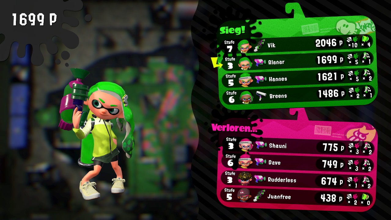 Die Kernattraktion des Spiels sind die Online-Gefechte, die sich über die zentrale Lobby aufrufen lassen. Zunächst lässt man neue Inkling-Schützen lediglich an die unbewerteten Revierkämpfe ran, sobald man da jedoch genügend Erfahrung(spunkte) gesammelt hat, öffnen sich die Ranglisten-Fights. Für jeden neuen Fisch im Teich eine einmalige Gelegenheit, sich erst in lockerer Umgebung mit dem grundlegenden Spielprinzip und den stufenweise freischaltbaren Waffen vertraut zu machen. Kenner des Vorgängers müssen die Tour aber selbstredend ebenfalls mitmachen, was zumindest durch fließiges Spielen recht schnell geht. In meinem Fall sind nur wenige durchzockte Nachmittage vergangen, bis ich für die Rangkämpfe freigeschaltet war – trotz der recht überschaubaren Anzahl an Spielern, die im Vorfeld der Veröffentlichung auf die Server zugreifen konnten.