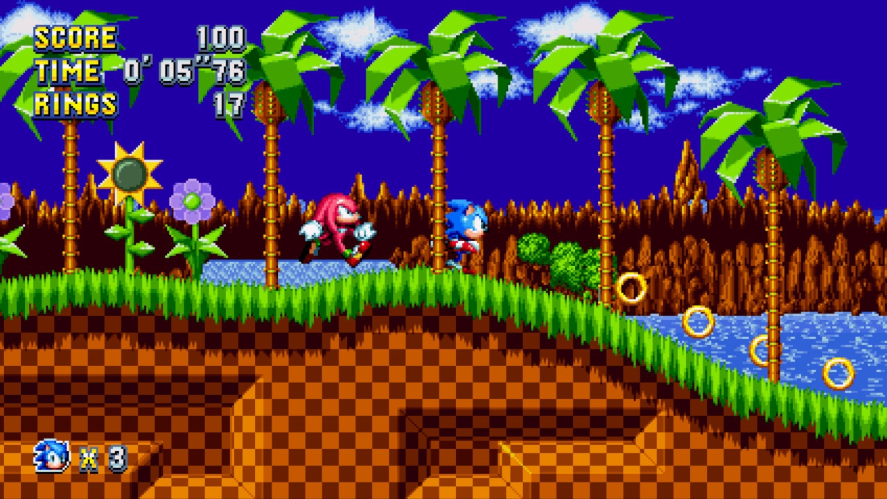 Worum geht’s? Um einen mysteriösen Edelstein, den Dr. Eggman mit seiner als Hard Boiled Heavys bekannten Robo-Schurkentruppe ausgegraben hat und Risse im Raum-Zeit-Gefüge verursachen kann. Sonic, Tails und – wenn auch etwas widerwillig – Knuckles sind ihm dabei natürlich direkt auf den Fersen, nur um nach der ersten Konfrontation in der guten, alten Green Hill Zone zu landen. Kurze Übergangssequenzen zwischen den Welten verraten euch, wie die Helden in das jeweils nächste Gebiet gelangen, eine allzu tiefe Handlung solltet ihr von diesem Jump 'n' Run klassischer Machart jedoch nicht erwarten. Braucht man auch nicht. Immerhin fand ein Großteil der Geschichte der Mega Drive-Klassiker im Handbuch statt. Viel wichtiger ist, dass wir uns nach der kurzen Einführung direkt im Spiel befinden und die altbekannte Anfangswelt des allerersten Sonic the Hedgehog-Titels erkunden. Den vertrauten Grafiken zum Trotz merke ich jedoch schnell, dass es sich hier nicht um die Green Hill Zone handelt, die ich aus Mega Drive-Zeiten kenne. Die Macher haben sich zwar im visuellen Bereich an den Klassikern des Igels orientiert, kredenzen euch jedoch beinahe komplett neue Kreationen, die teils markante Strecken der Originale neu vermischen – mit besonderen Gruß an meinen persönlichen Albtraum-Korridor aus der Chemical Plant – und teils frische Elemente ergänzen.