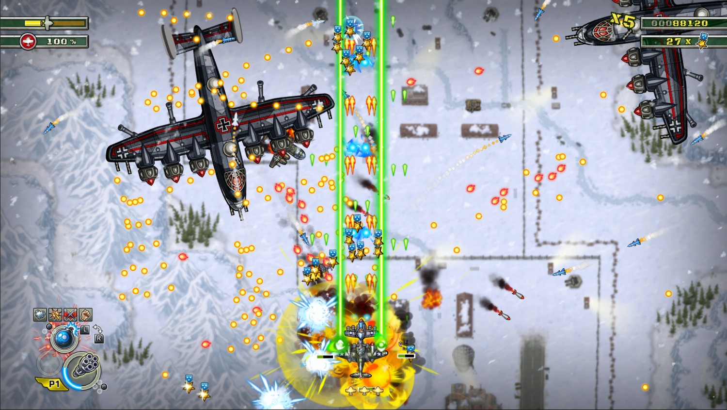 Unser Squadron besteht zwar immer aus vier Piloten, aber hin und wieder lassen wir auch Amateure ans Steuer. Die müssen sich nur in den Coop-Einstellungen verbinden und die sogenannten Joy-Cons aufteilen. Dann geht’s auch schon in die Luft und es wird losgeballert! Die restlichen, KI-gesteuerten, Flügelmänner sammeln sich dann hinter Flieger 1 und die übrigen Flieger müssen auf eigene Faust klarkommen. Damit es aber für die Greenhorns nicht zu schwierig wird, darf die Flugmaschine auch fünfmal dem Game Over entgehen, normalerweise haben wir nur drei Chancen. Aber ihr da draußen: Seid gewarnt! Die Deutschen sind ein zähes Volk und ihre wahnsinnigen Wissenschaftler haben so manches Flaggschiff erbaut, das in Bosskämpfen nur zu gerne das Feuer auf uns konzentriert …